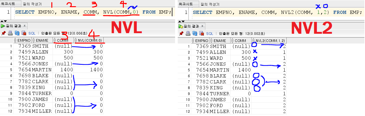 ■ NVL( 컬럼명, 대체값 ) NVL2( 컬럼명 , 대체값1 , 대체값2 ) 함수
