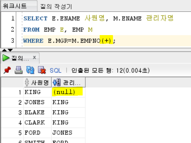 ex) EMP테이블의 KING의 관리자는 없음. 그럼 조인시켰을때 아무도 없음(IS NULL)