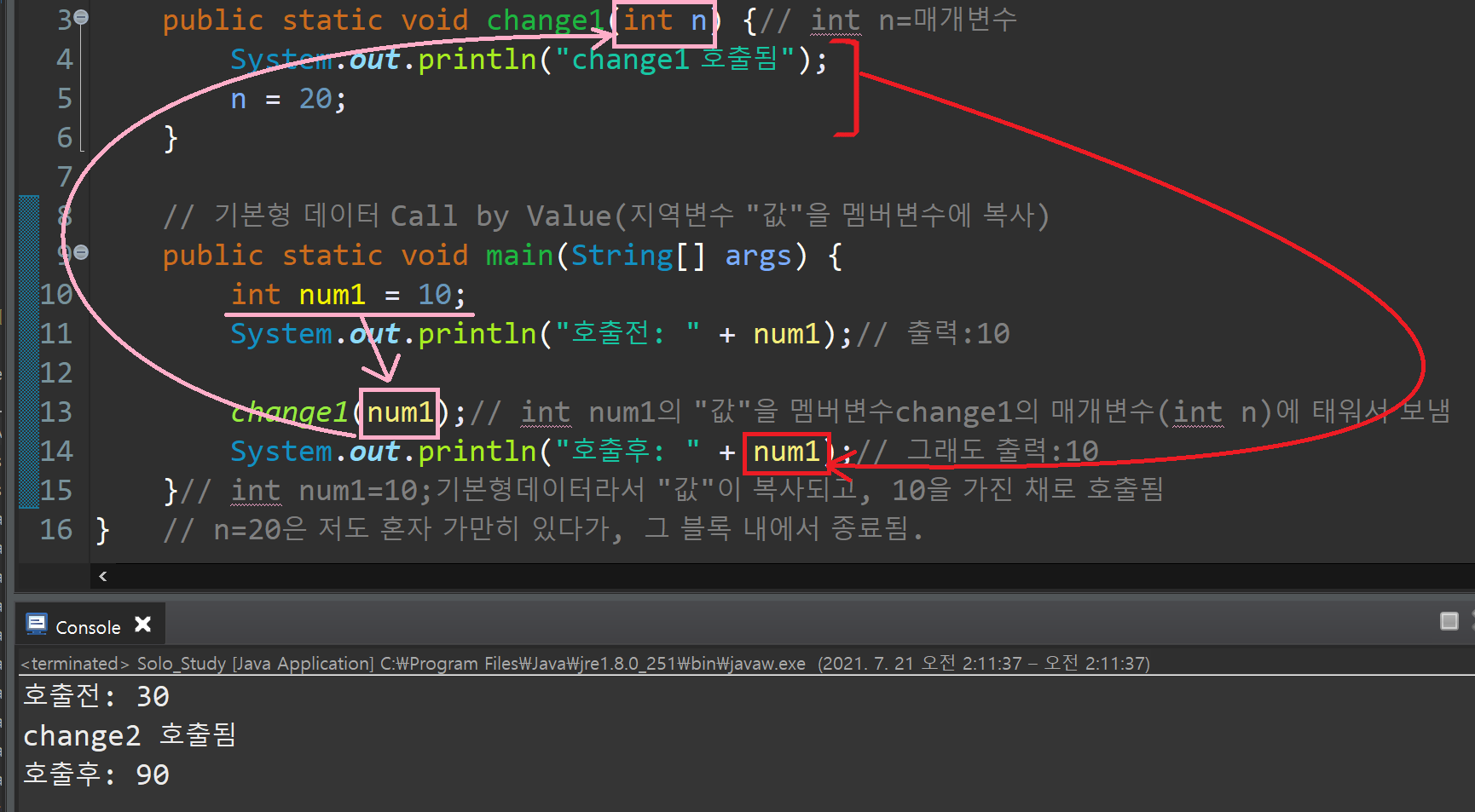 ㄴchange1 함수에, num1의 값을 가져간다는거임.