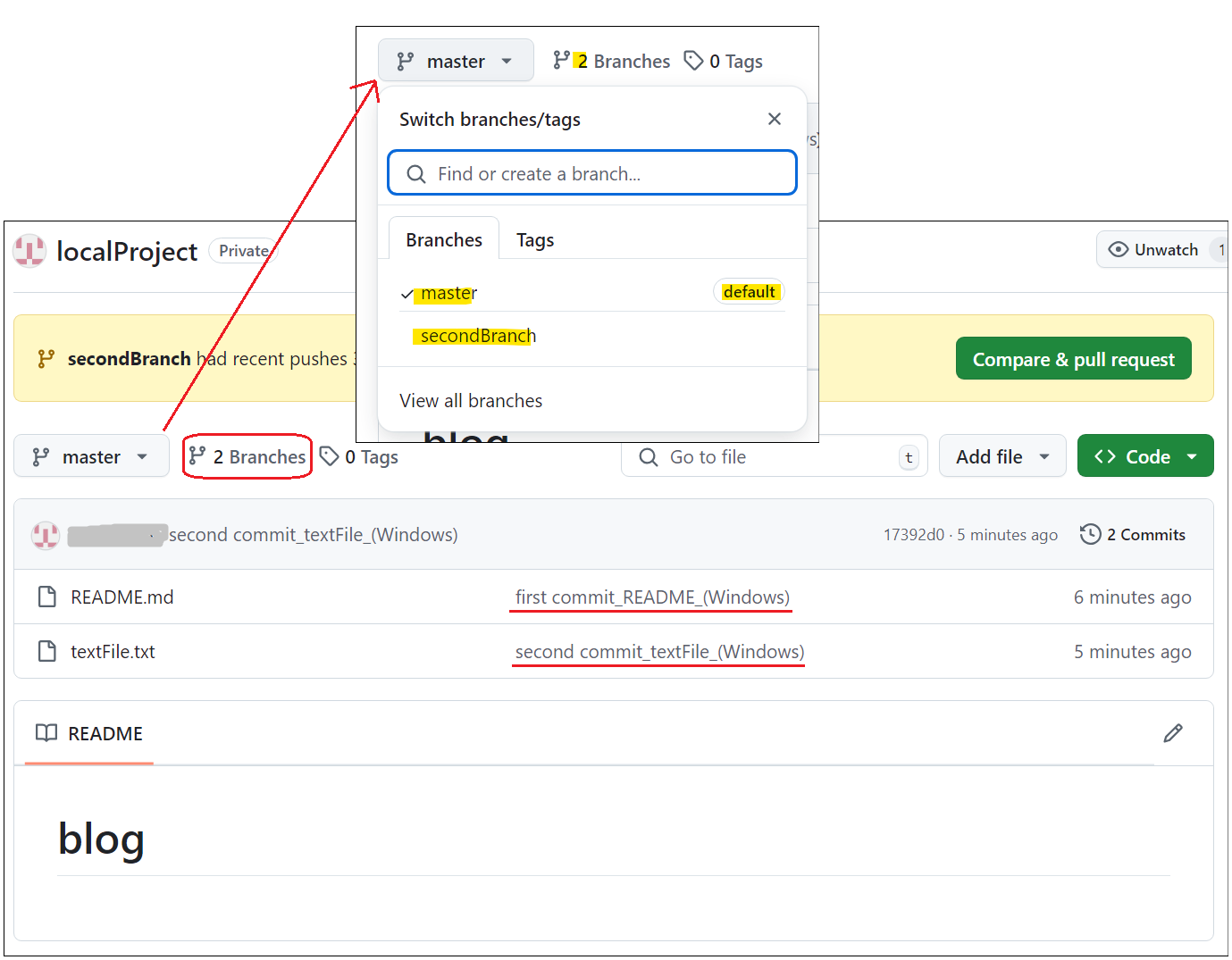 master 브랜치에서 commit push했던 'README.md', 'textFile.txt'는