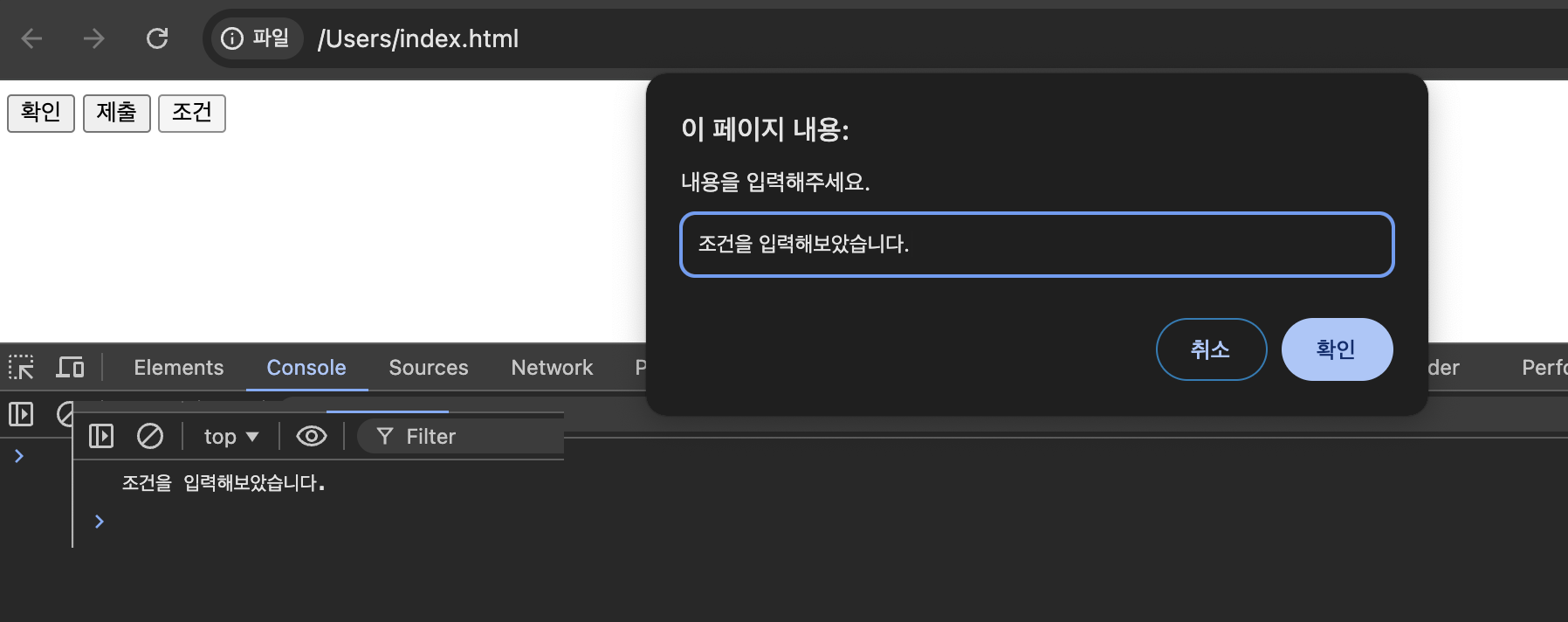 - 조건 버튼을 누르면 prompt 있는 함수 호출. 입력값이 리턴값이 되어서 console.log로 출력
