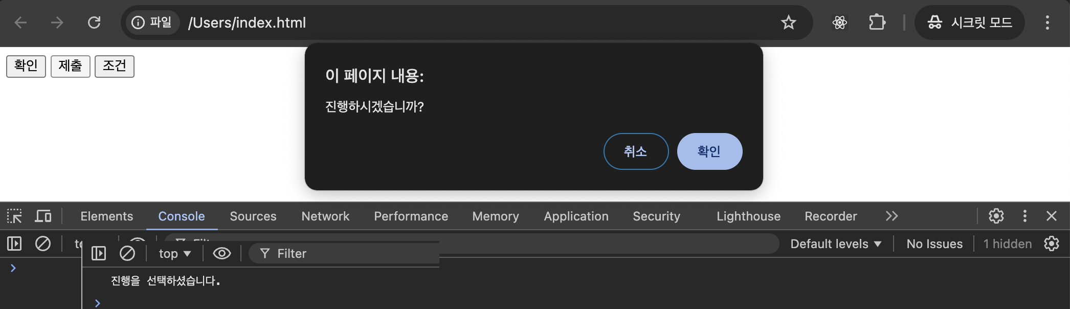 - 제출 버튼을 누르면 confirm 이 있는 함수 호출. 확인을 누르면 console.log 출력.