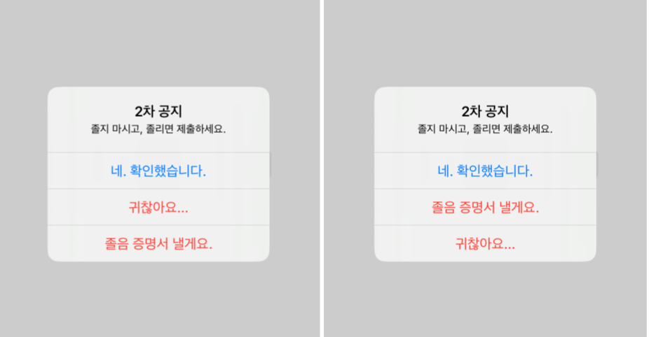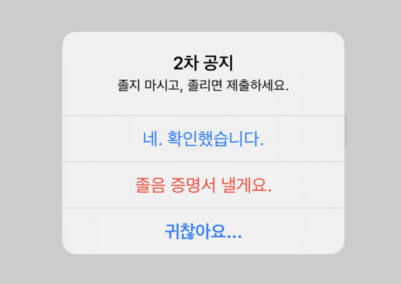let alert = UIAlertController(title: "2차 공지", message: "졸지 마시고, 졸리면 제출하세요.", preferredStyle: .alert)