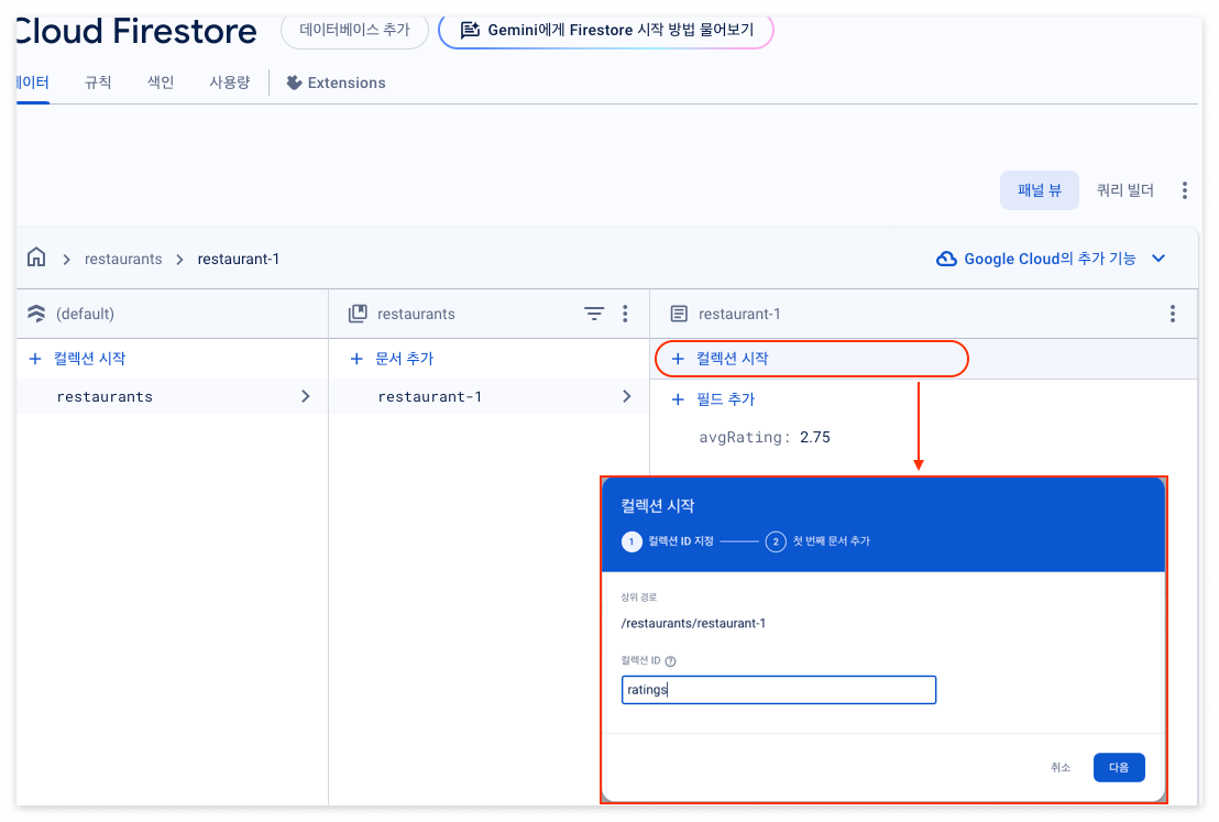 하위 문서 ID에 'ratings' 컬렉션 시작.
