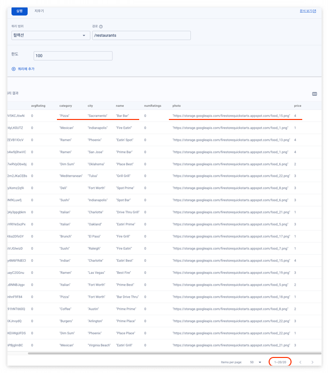 addRestaurant도 20번 호출되면서 Firebase Database에 insert된거다.