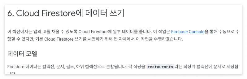 [데이터 모델] 섹션은 Codelab이 Firestore 데이터에 대해 설명해주는 부분.