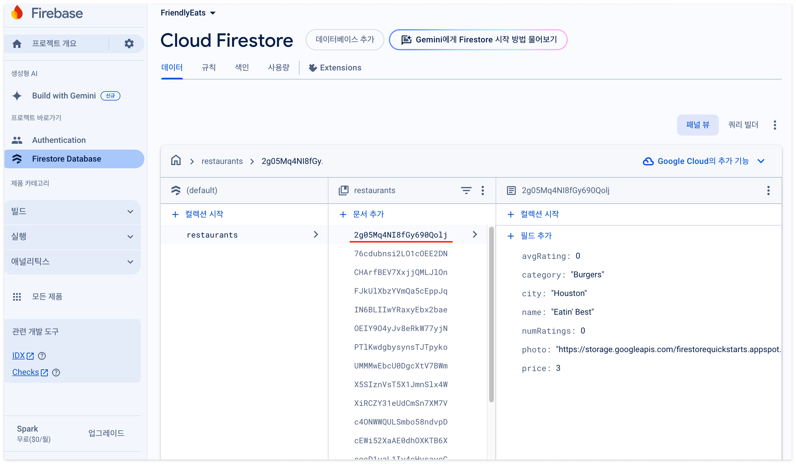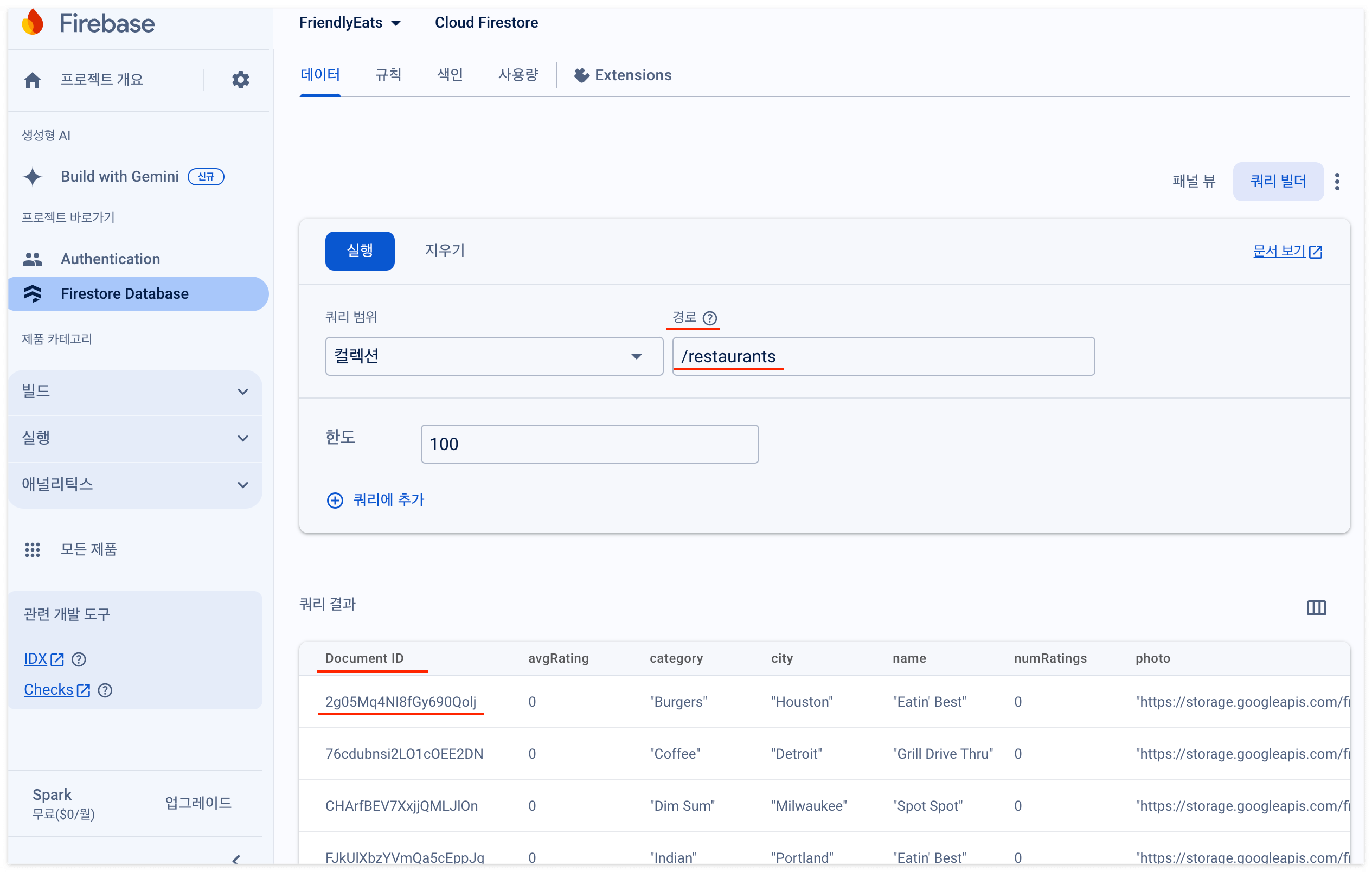 최상위 collection restaurants 하위 문서에 비슷하게 생긴 문자열이 있다.