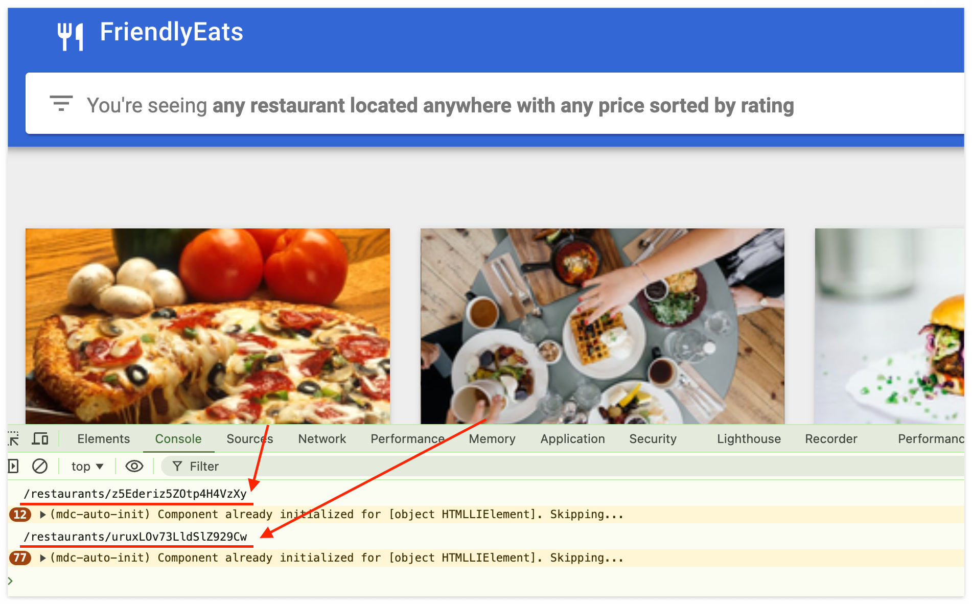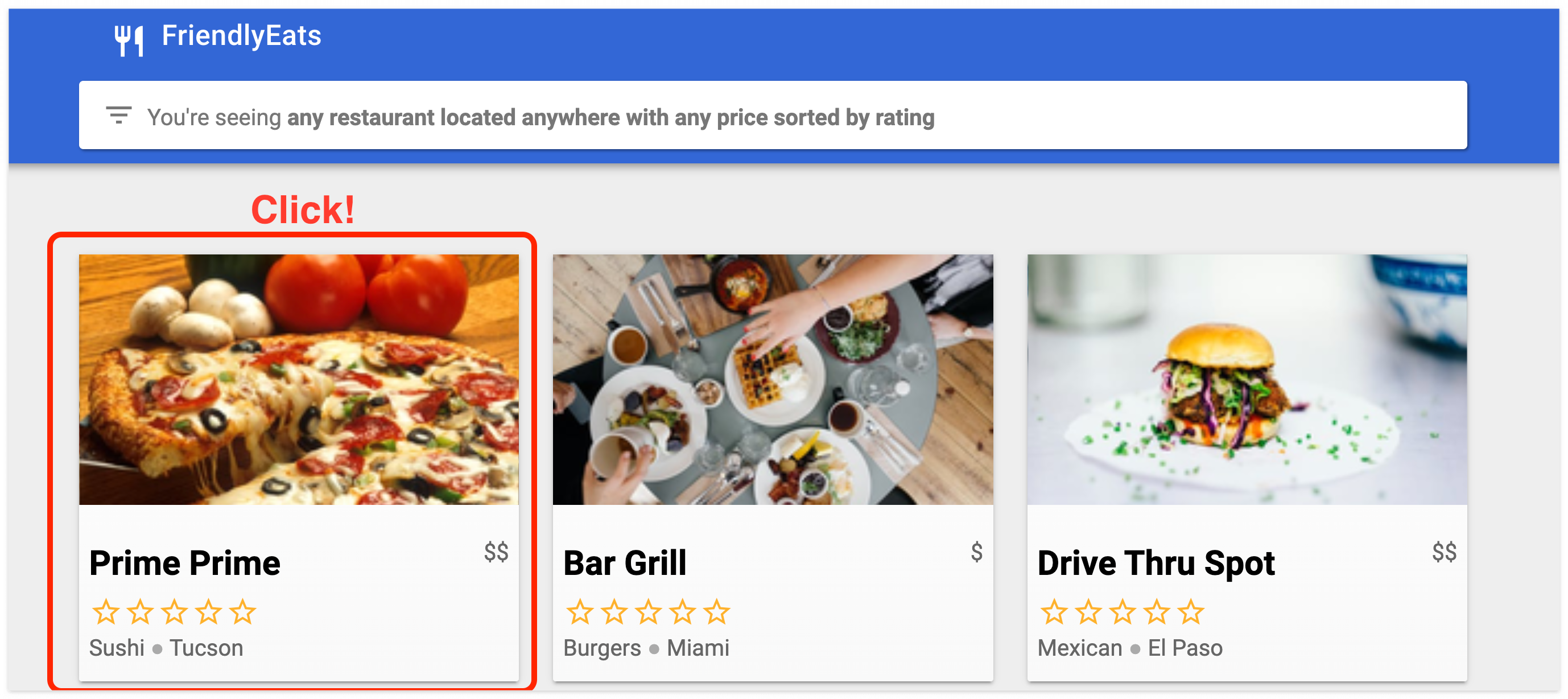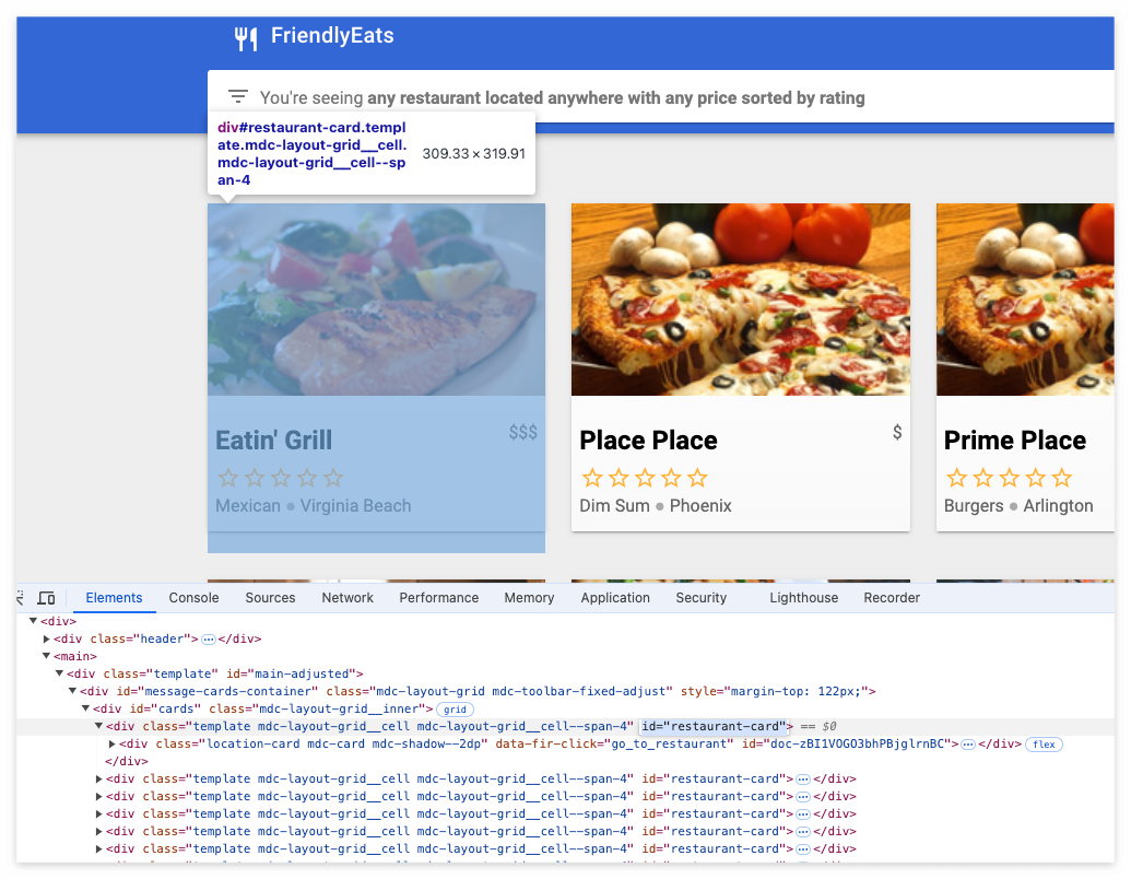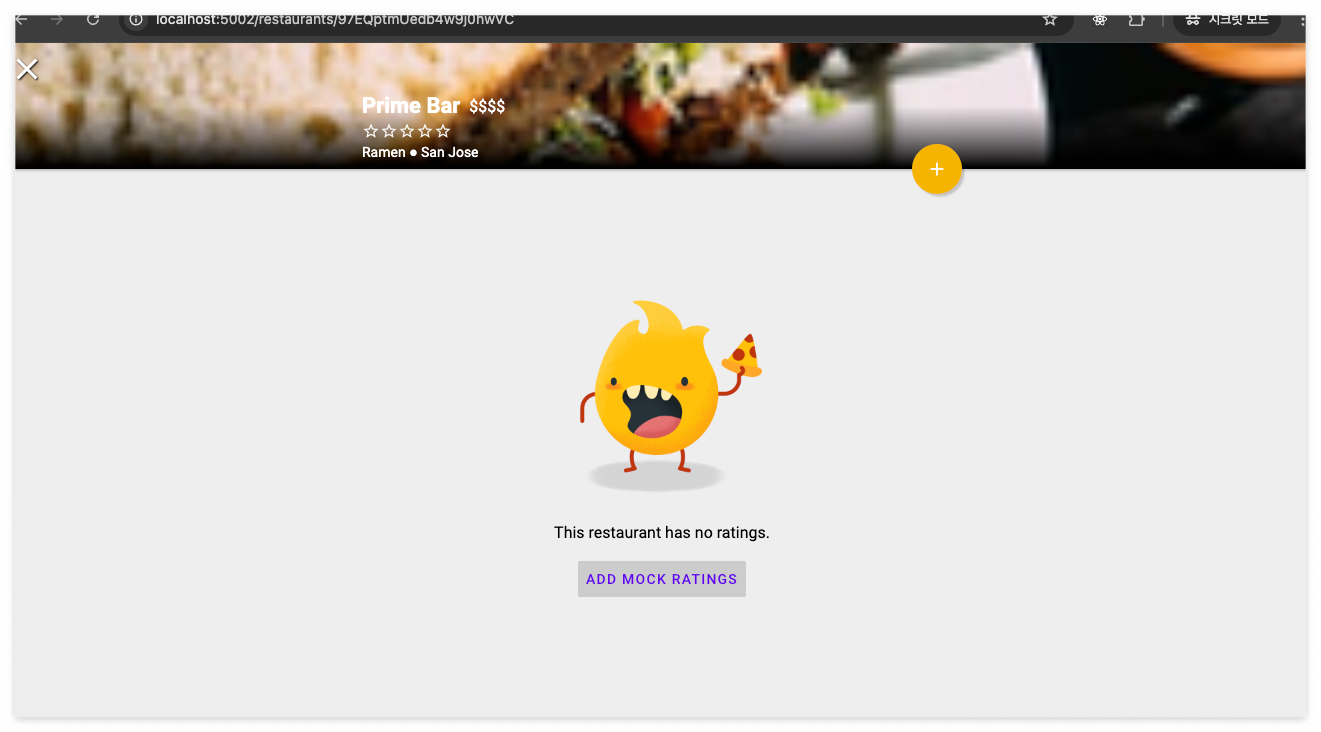 FirendlyEats 앱에서 레스토랑을 다르게 클릭해본다.