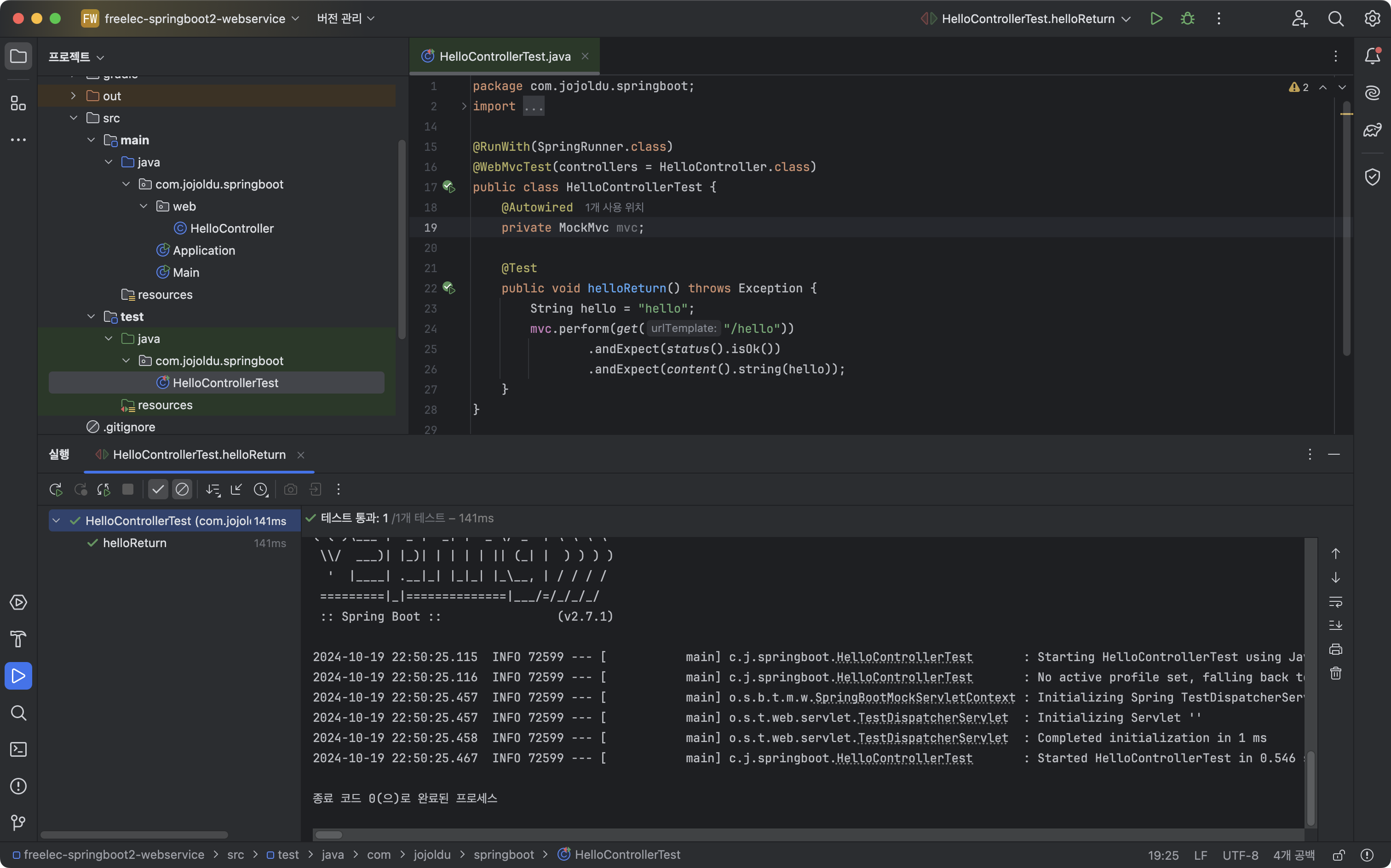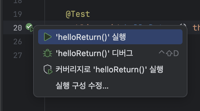 @Test 어노테이션이 있는 함수helloReturn 왼쪽 줄라인에 보이는 ▷을 눌러야함.