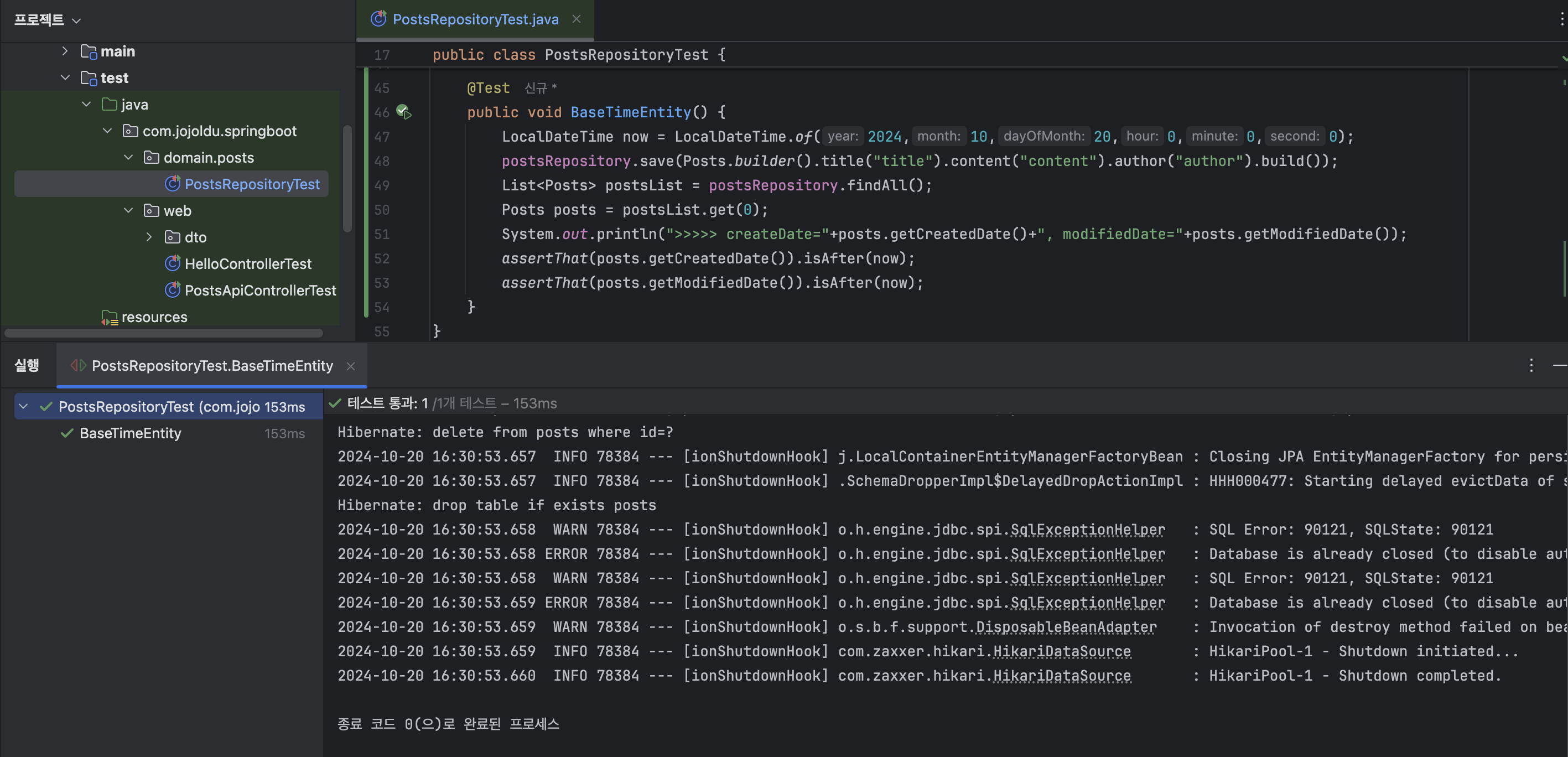 src/test/java/com/jojoldu/springboot/domain/posts - PostsRepositoryTest.java - BaseTimeEntity 함수 추가