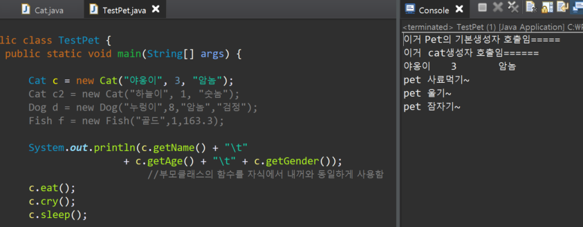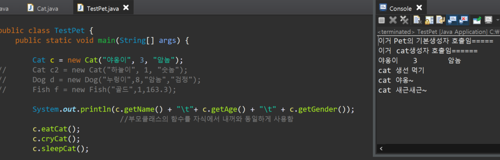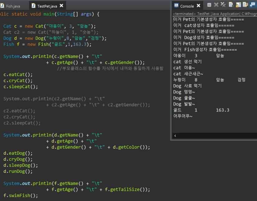 | [ TestPet 클래스 함수 ] main 함수 포함 Cat c = new Cat("야옹이", 3, "암놈"); Cat c2 = new Cat("하늘이", 1, "숫놈"); Dog d = new Dog("누렁이",8,"암놈","검정"); Fish f = new Fish("골드",1,163.3); System.out.println(c.getName() + "\t" + c.getAge() + "\t" + c.getGender()); c.eatCat(); c.cryCat(); c.sleepCat(); System.out.println(c2.getName() + "\t" + c2.getAge() + "\t" + c2.getGender()); c2.eatCat(); c2.cryCat(); c2.sleepCat(); System.out.println(d.getName() + "\t" + d.getAge() + "\t" + d.getGender() + "\t" + d.getColor()); d.eatDog(); d.cryDog(); d.sleepDog(); d.runDog(); System.out.println(f.getName() + "\t" + f.getAge() + "\t" + f.getTailSize()); f.swimFish(); |