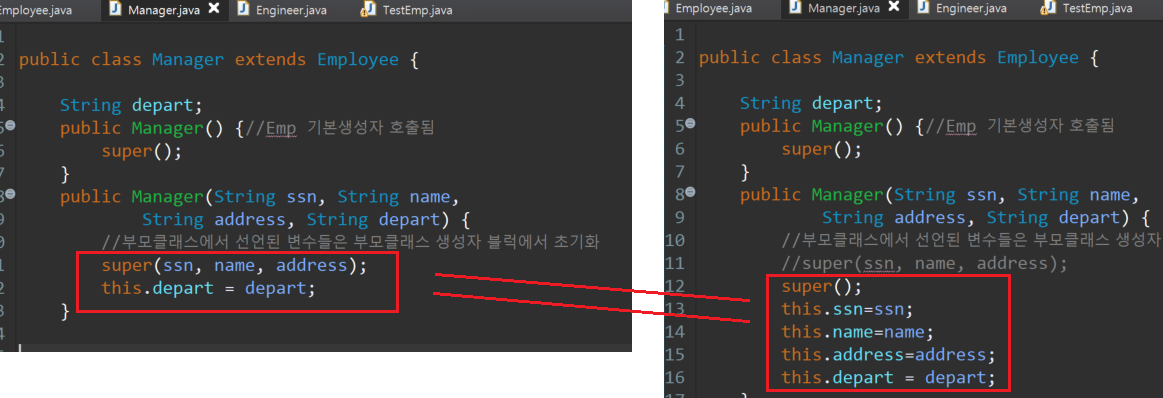 거기에 Manager 클래스의 멤버변수인 String depart를 추가한! 생성자인 것.