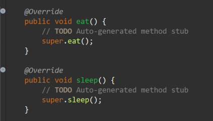 | [ Dog 클래스 함수 ] //동작 //////////////////////////// 공통부분 public void cryDog() { System.out.println("Dog 멍멍~"); } public void eatDog() { System.out.println("Dog 사료 먹기"); } public void sleepDog() { System.out.println("Dog 쿨쿨~"); } ////////////////////////////////////// //다른 애완동물에 없는 Dog함수 가정... public void runDog() { System.out.println("Dog 발발~"); } |