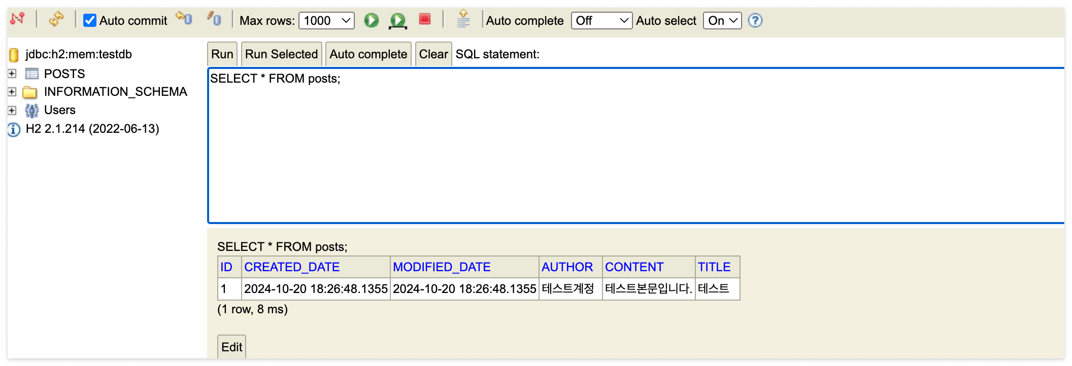 제대로 jpa를 통해서 h2 디비에 INSERT 되었는지 확인하러 감. (프로젝트 서버 끄면 초기화되니까 끄면 안되고 바로!)