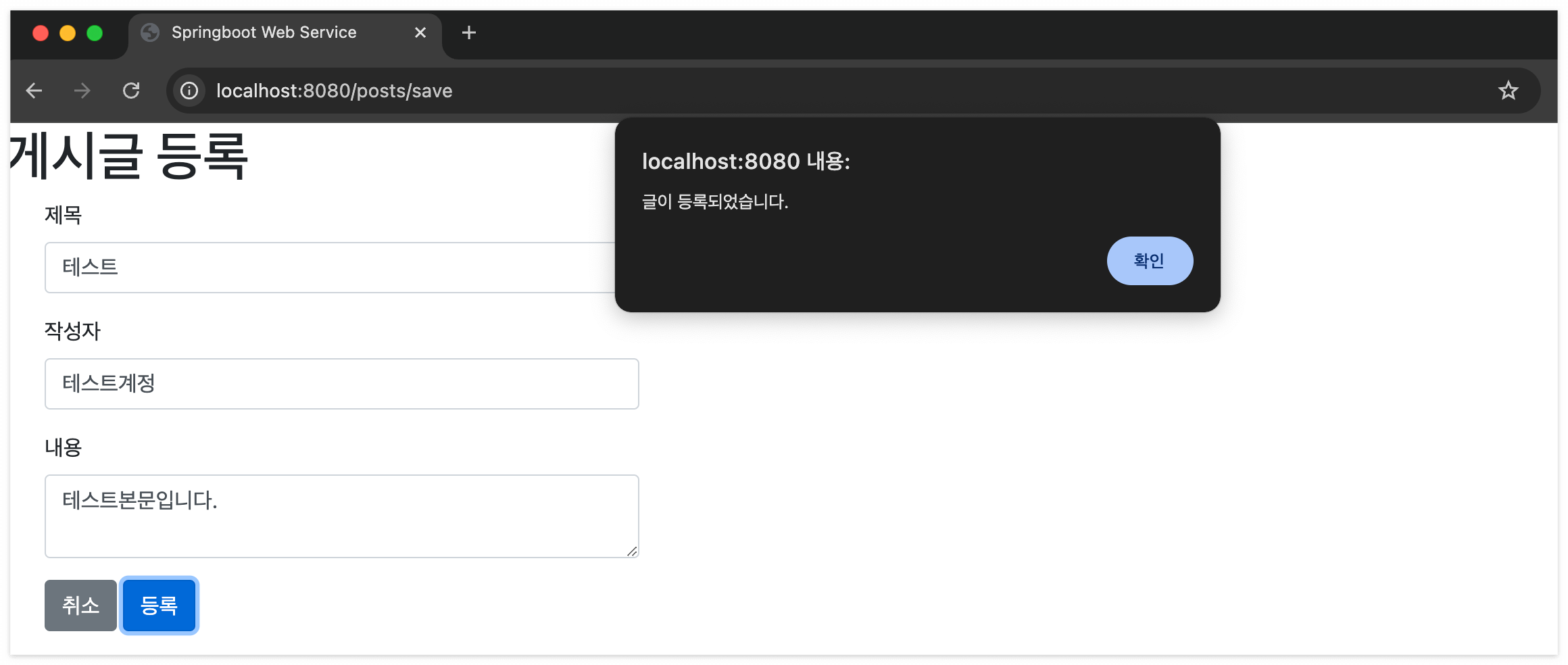 크롬 브라우저 주소창 localhost:8080 요청. '게시글 등록'으로 이동.