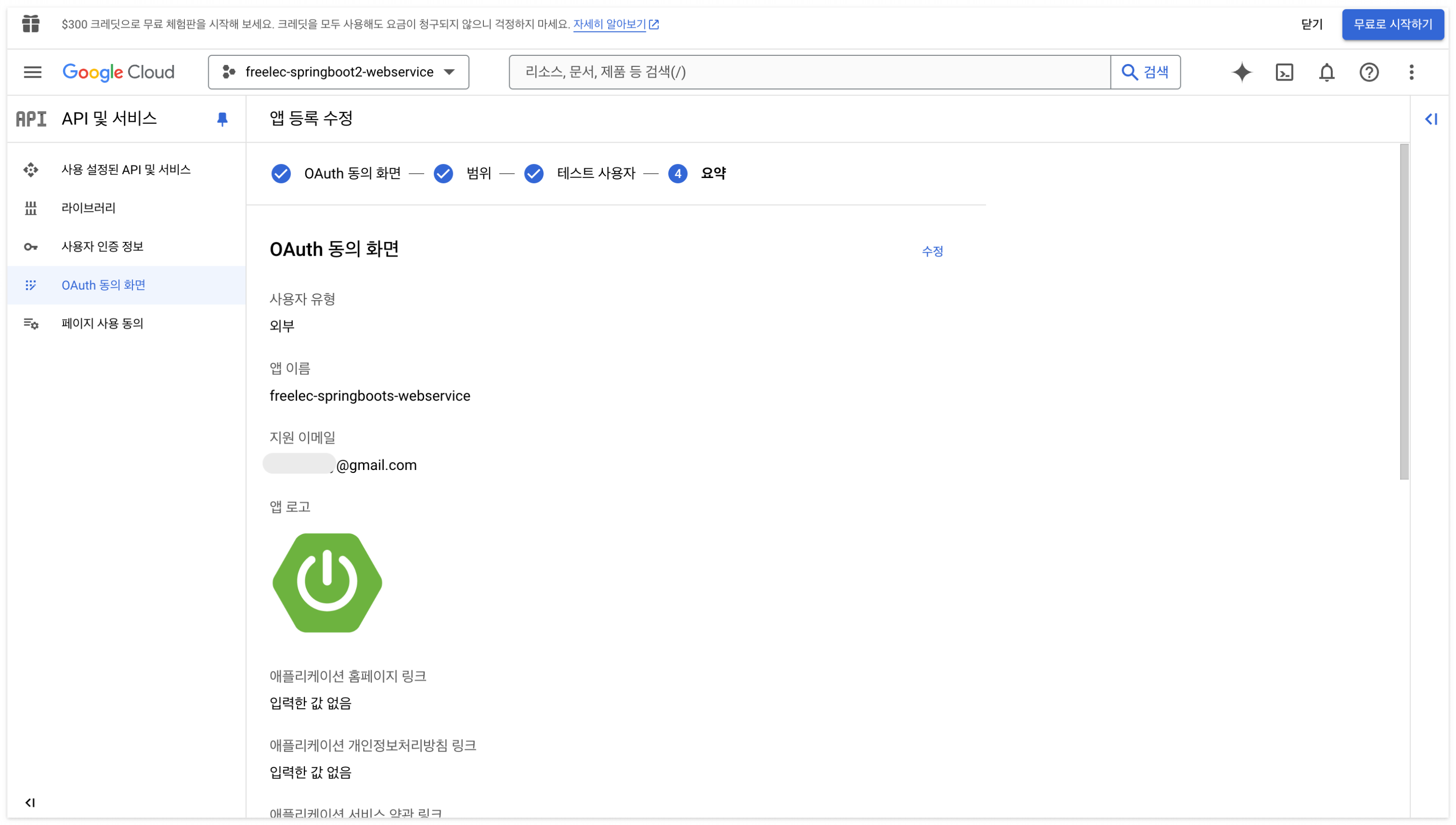 4. 요약 -> '동의 화면 구성' 완료.