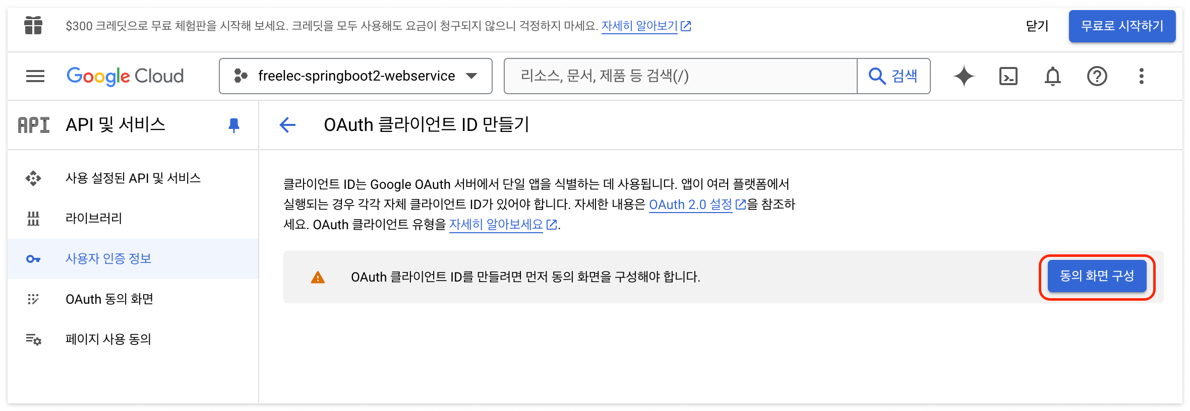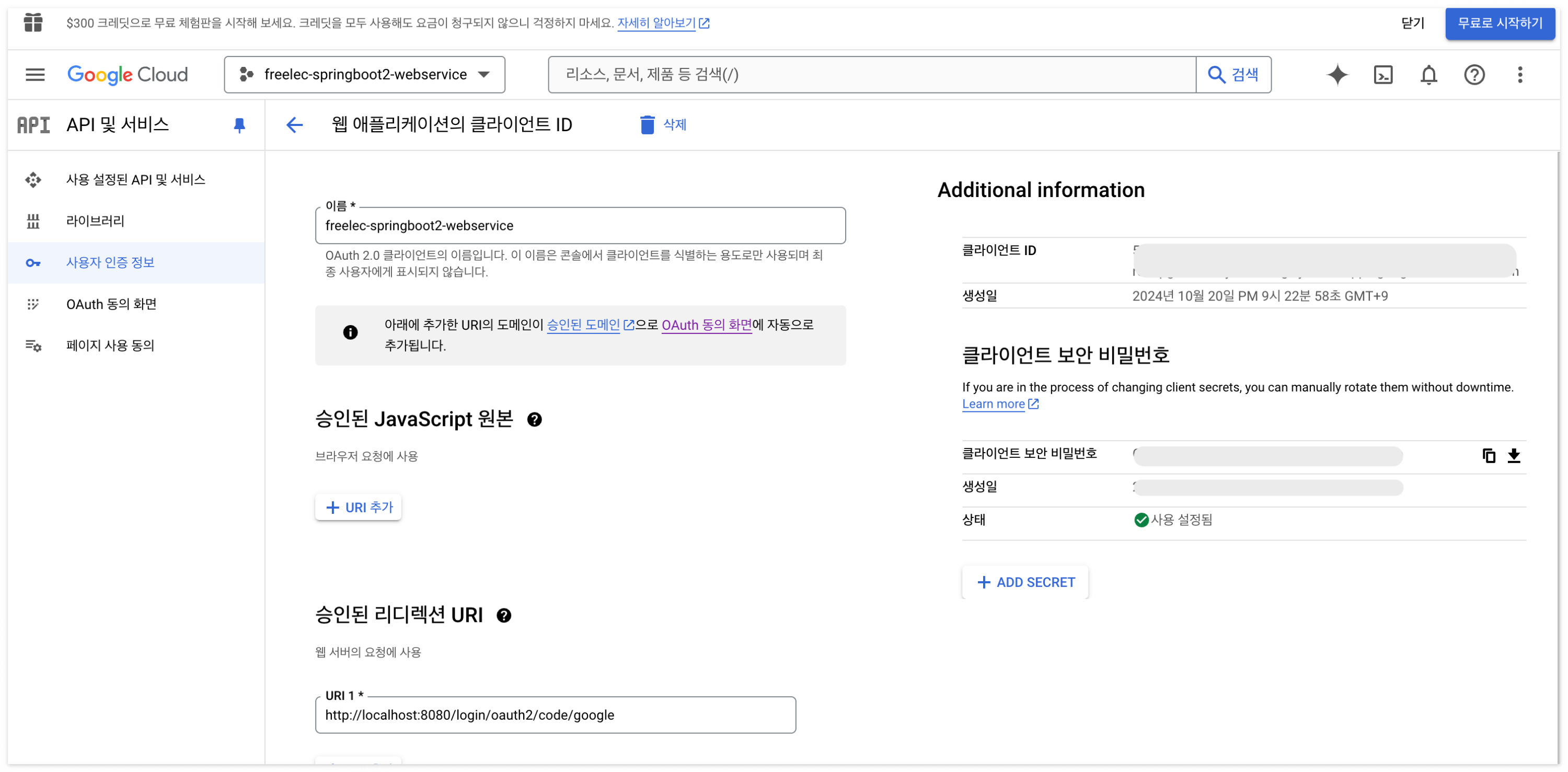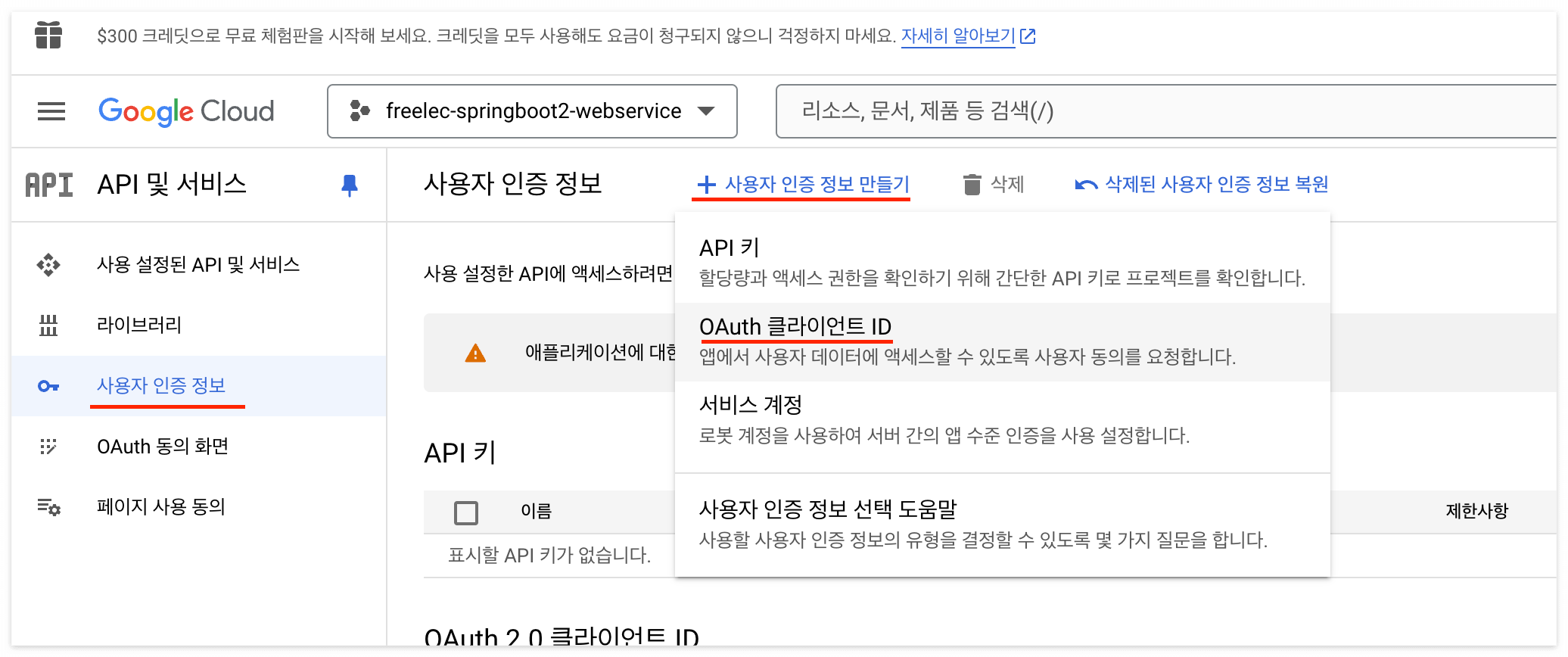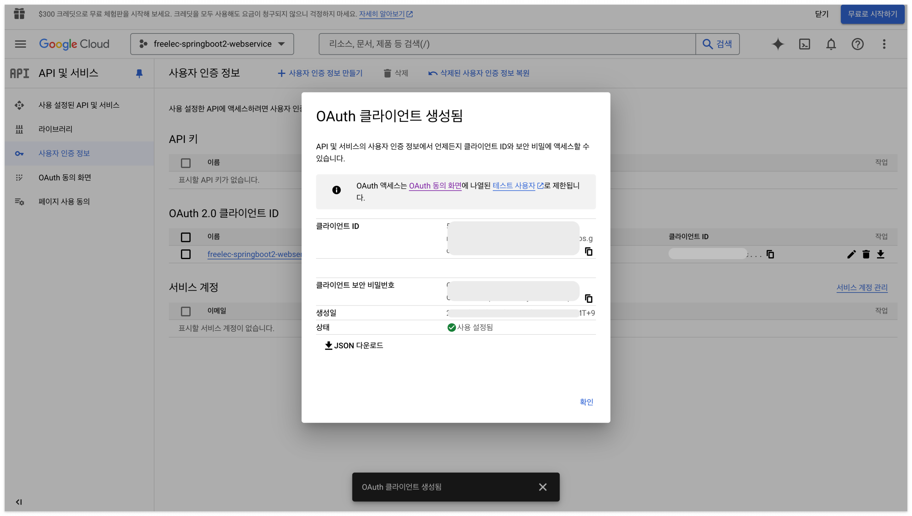 '확인' - 'OAuth 2.0 클라이언트 ID' - freelec-springboot1-webservice 클릭해서 이동.