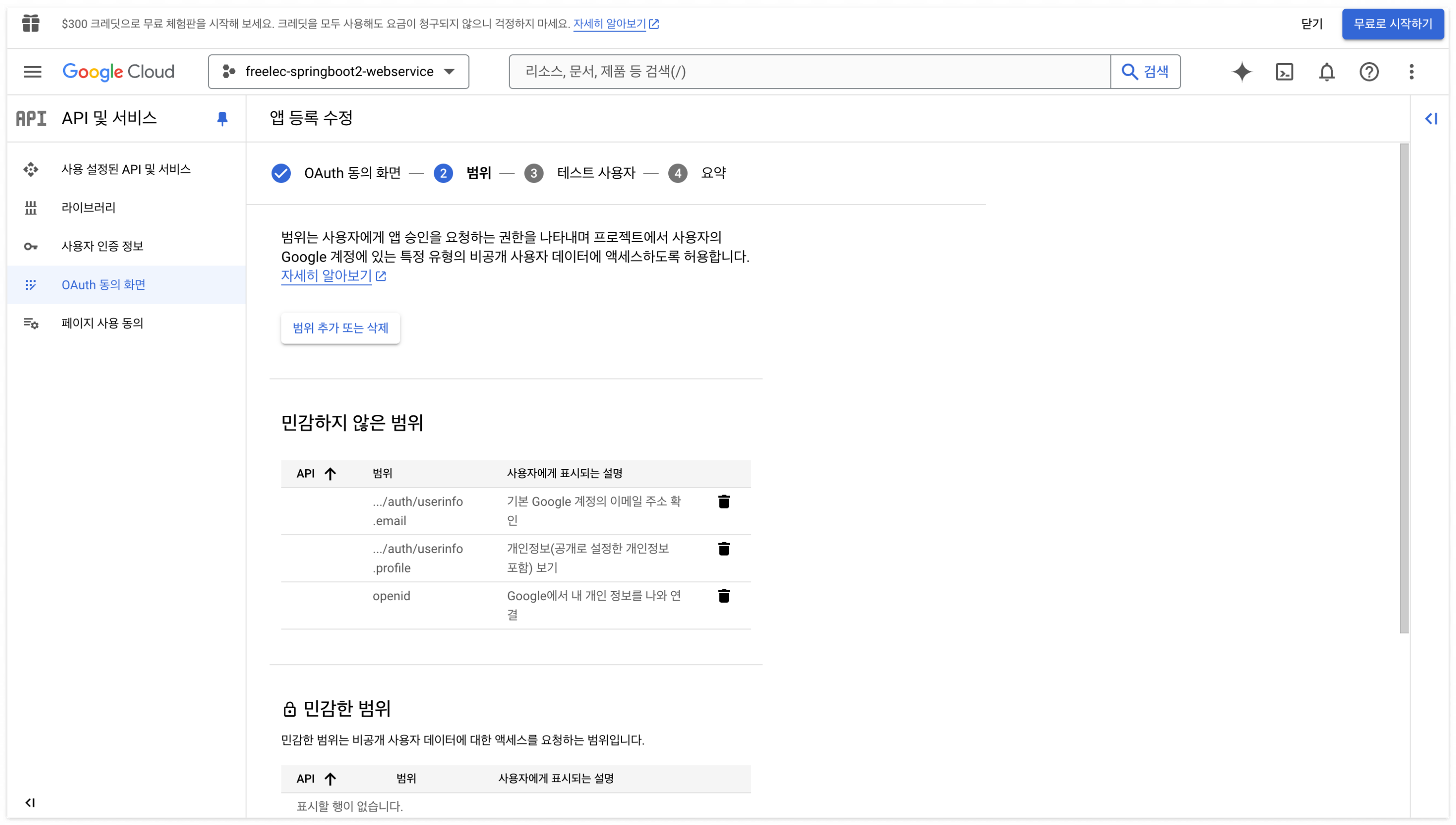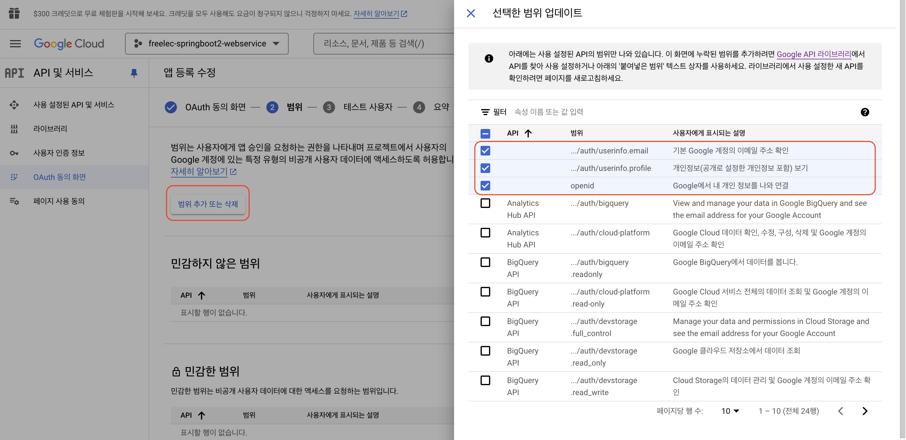 2. 범위 - '민감하지 않은 범위' email, profile, openid 3개만 추가