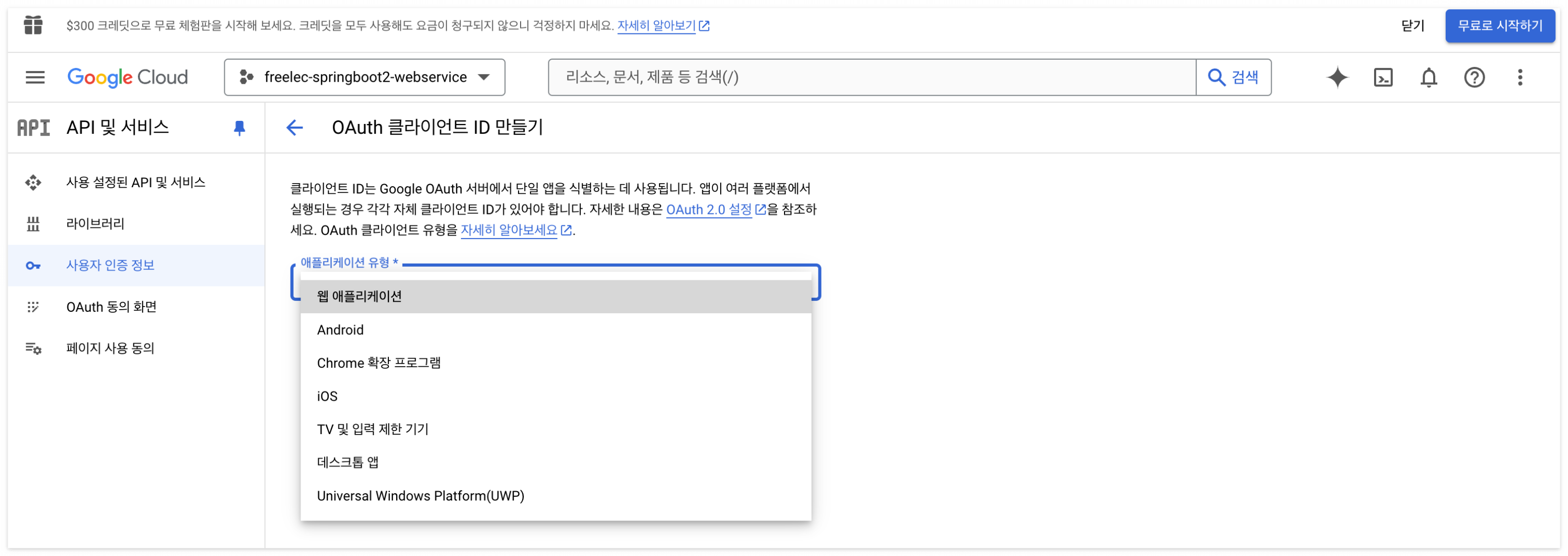 사용자 인증 정보 - OAuth 클라이언트 ID 선택.