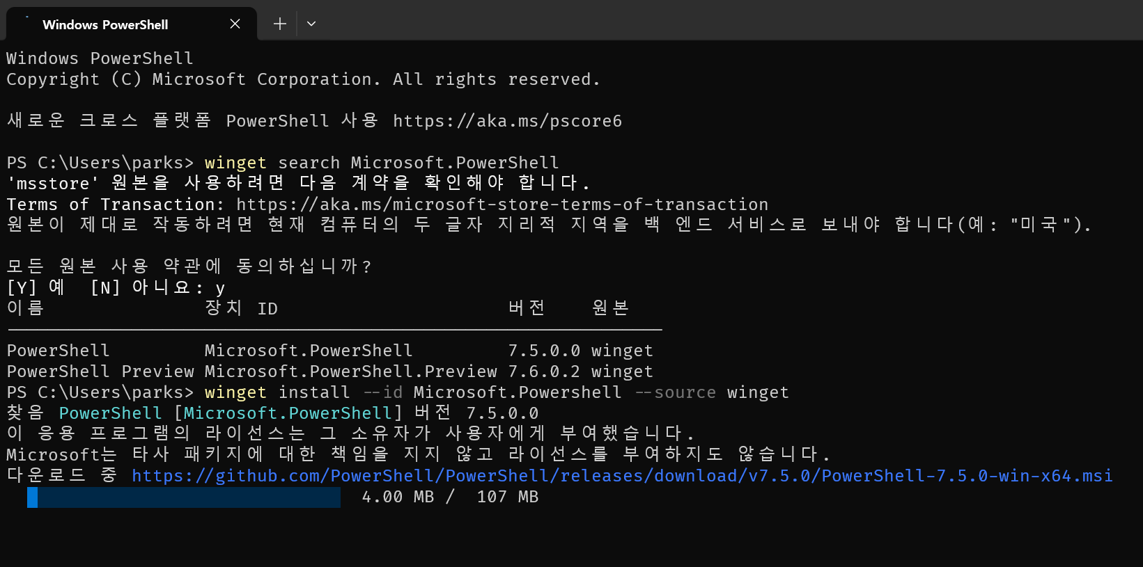 (근데 이미 내 pc powershell은 버전 7.4. 뭐시기였던거 같은데 또 해도 무방하니까 그냥 따라가기)