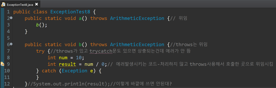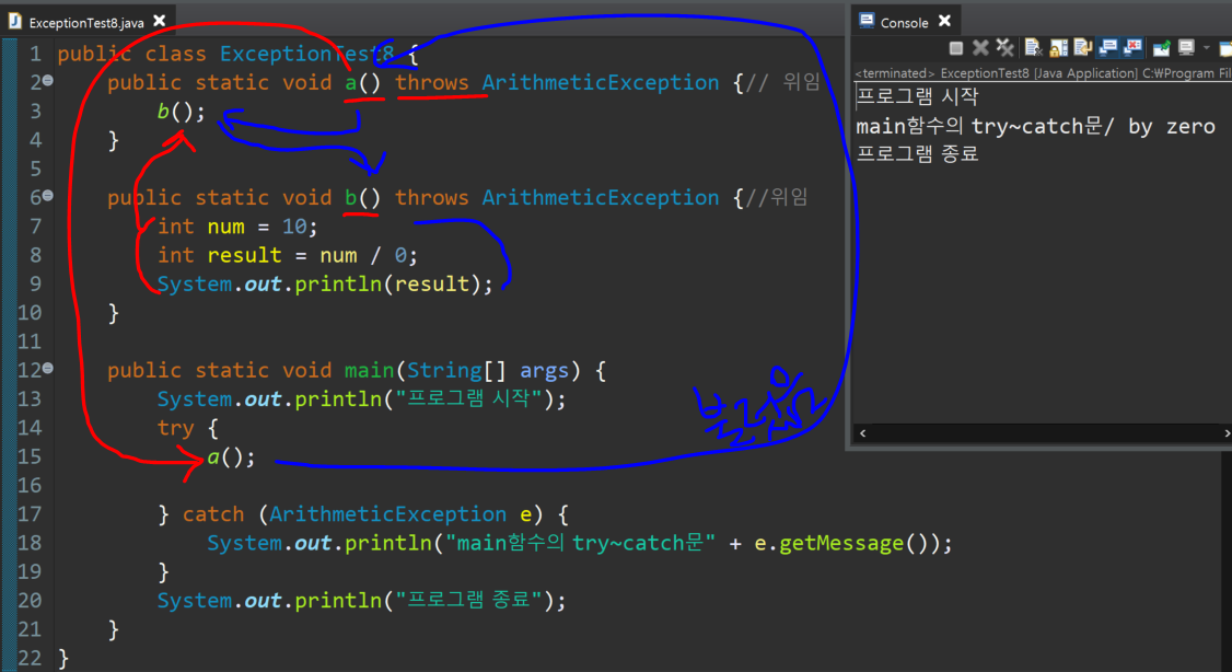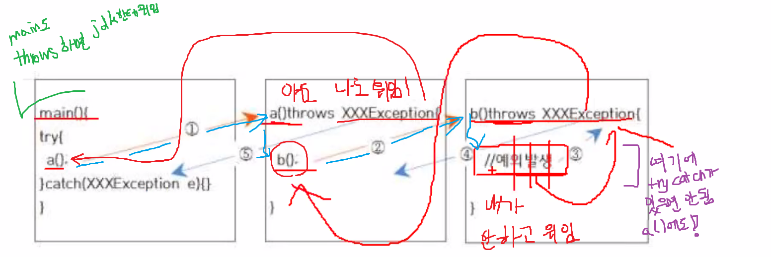 throws : Exception 처리를 내가 하지 않고 위임함. -나를 호출한 함수에게 처리를 위임