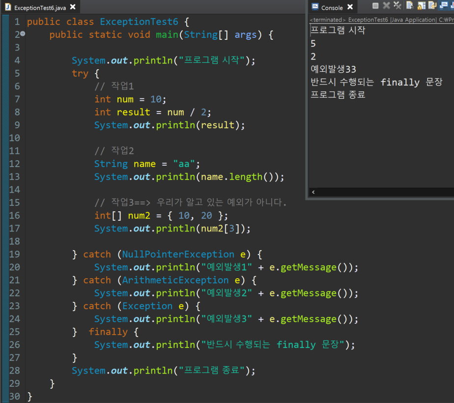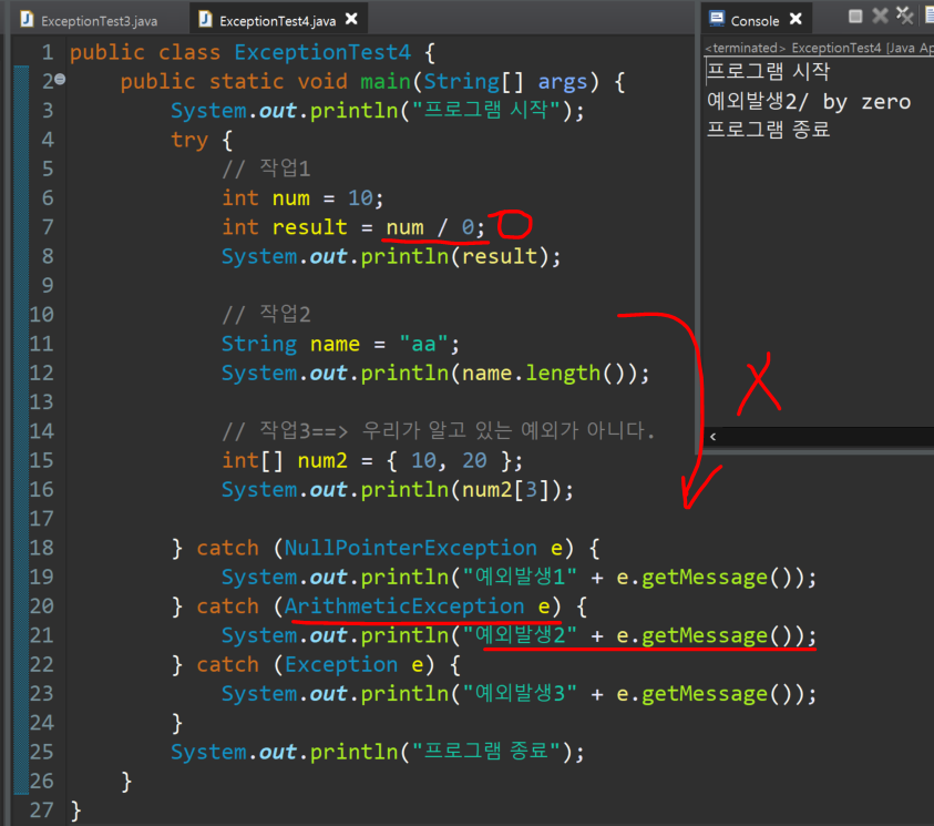 예외발생코드 // int num = 3/0 ; //ArithmeticE 발생