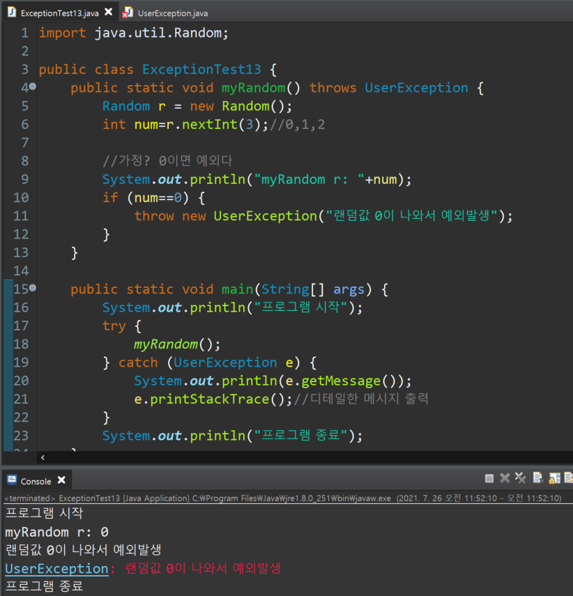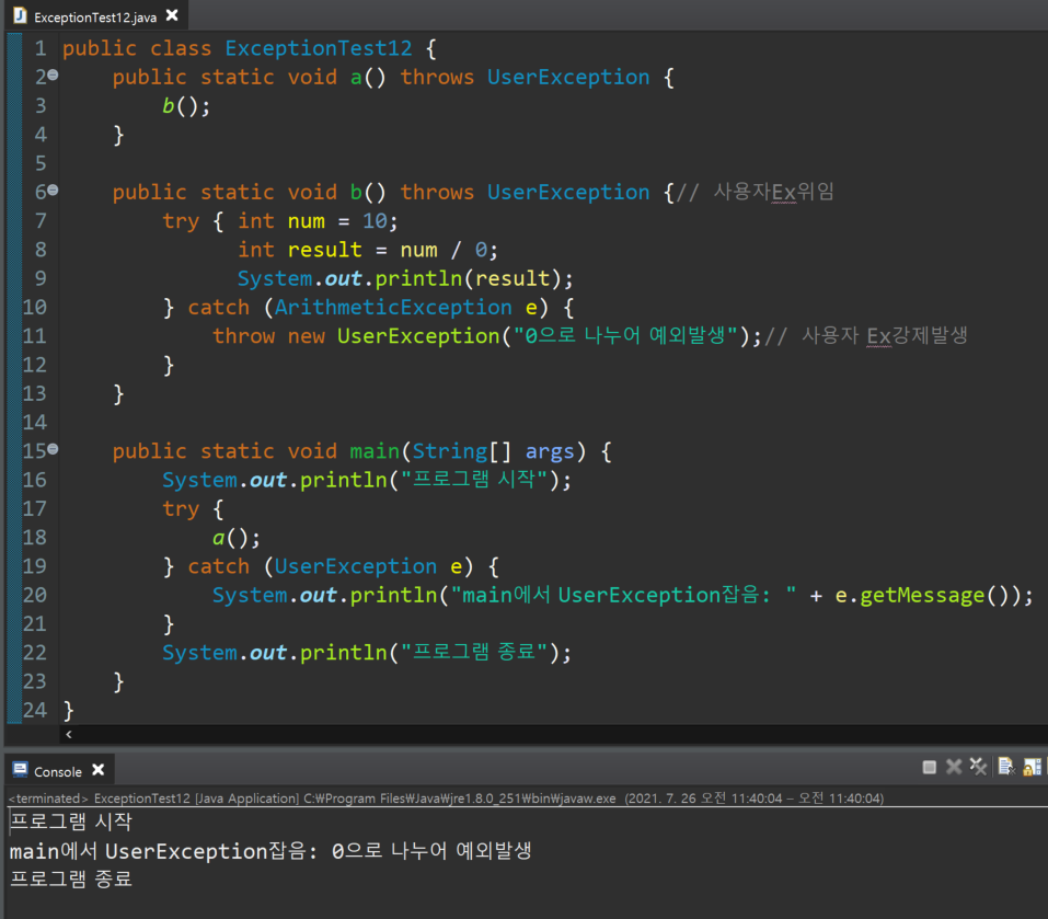 ㄴmain함수가 UserException 타입으로 받아서 예외잡고 출력