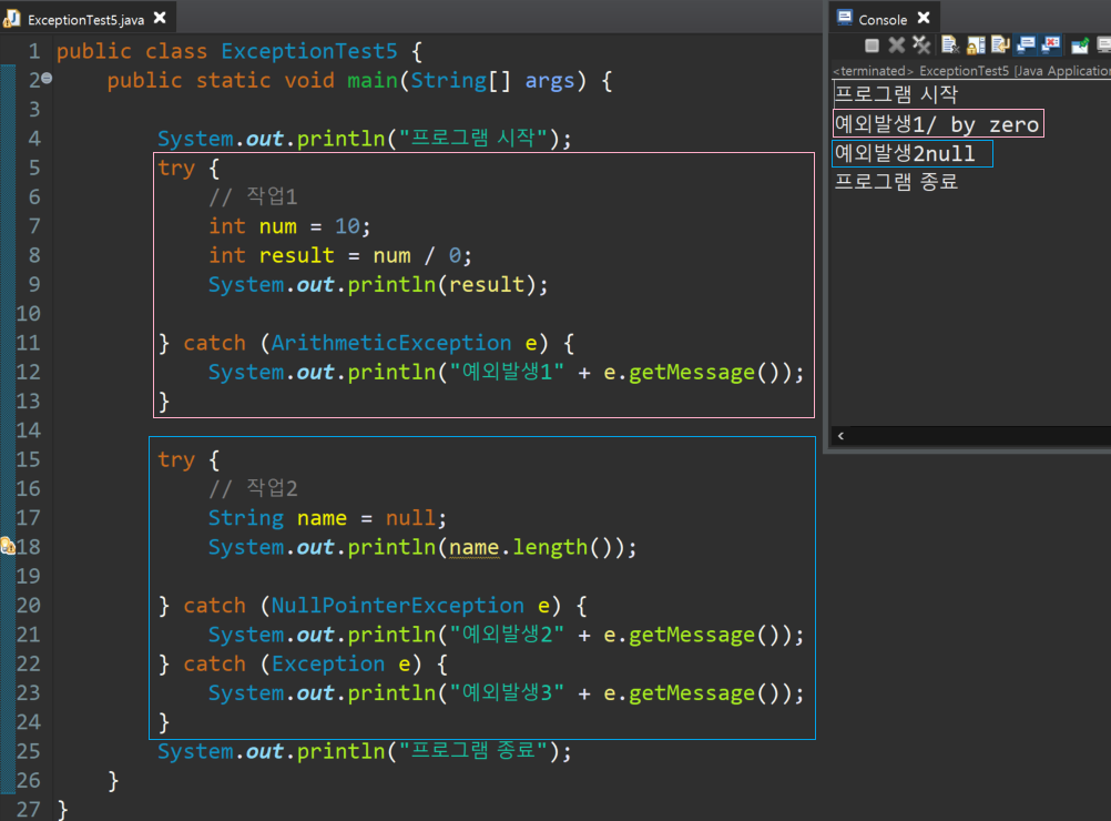 } catch (예외클래스명 변수명 ) { // ArithmeticE가 뜨면 e이라는 이름으로 이용.