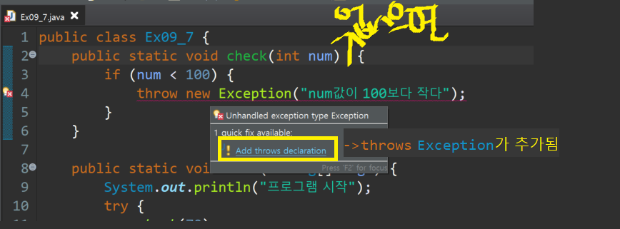만약 ' throws Exception '이 없다면 아래 에러가 뜨는데 Add하면 또 알아서 추가됨