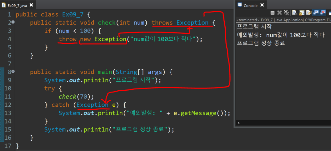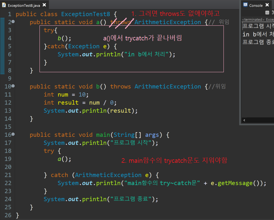 ㄴtry-catch문을 어디서 쓰는지에 따라 throws가 사용중단 되는지도 달라짐