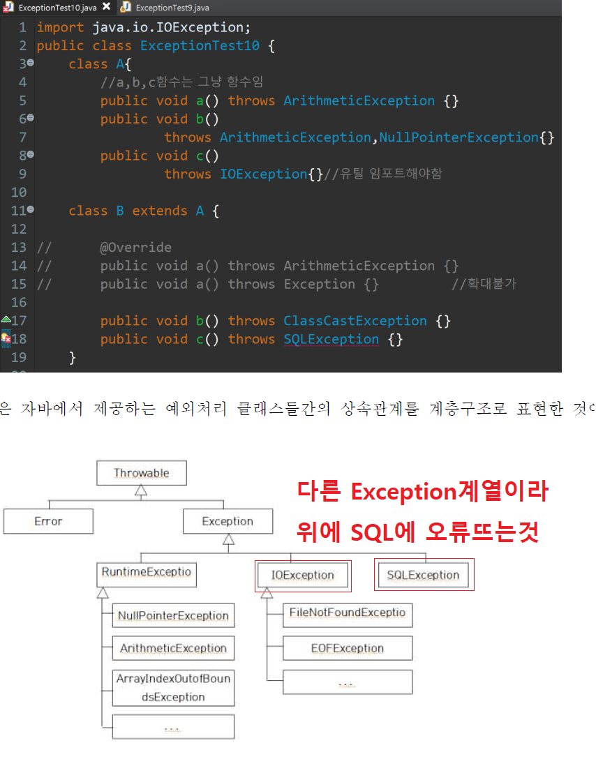 throws 예외클래스는 계층구조에서 같거나 작은 타입만 가능하다.