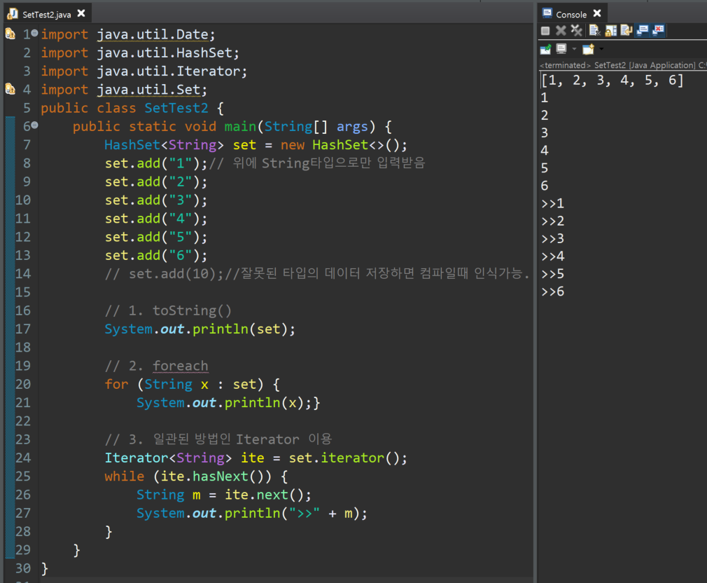 ex) Iterator <String> ite = set.iterator(); // set안에 String타입의 1,2,3,4,5,6 값 있음.