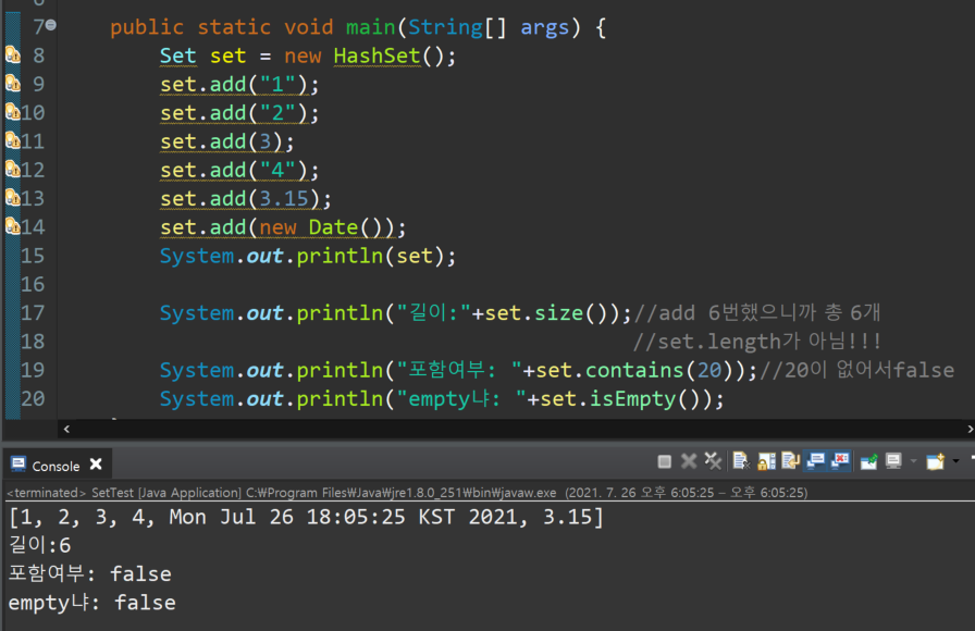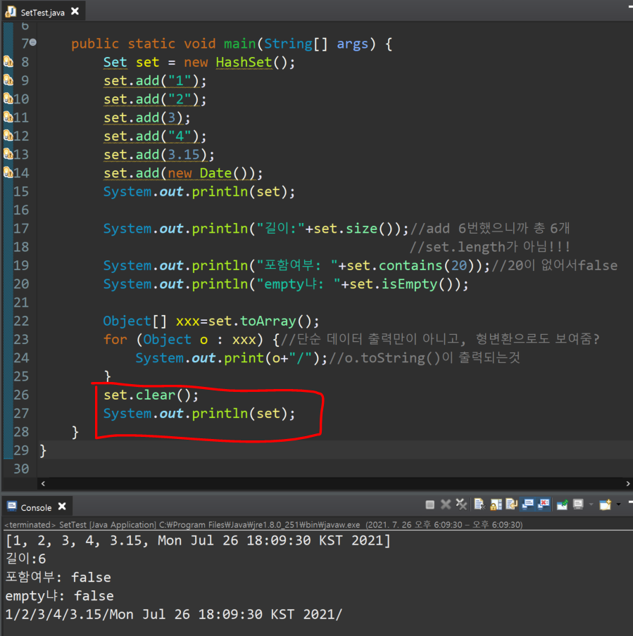 - <Set,List타입의> 변수.isEmpty( ); ==> boolean 타입. 비어있는지?