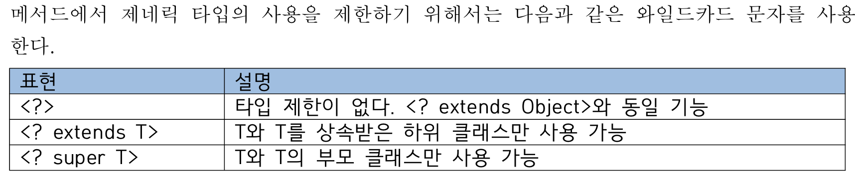 <T extends 타입>에 설정 가능한 타입은 해당 타입과 그 자식 클래스로 한정된다.