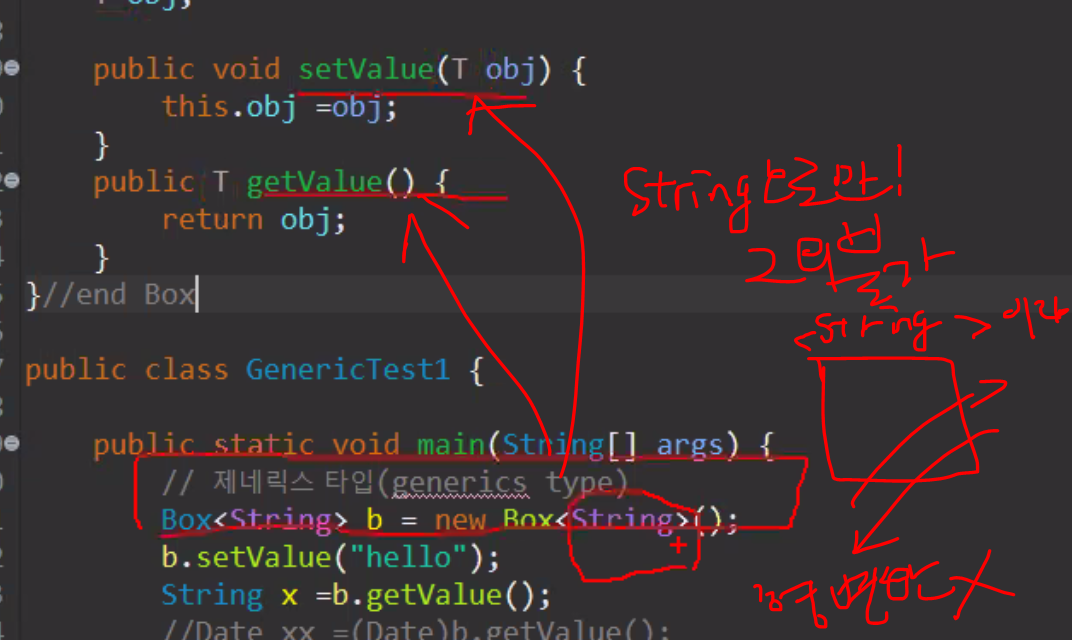 public class 클래스이름< T extends 타입> { ~ } // 파라미터 선언