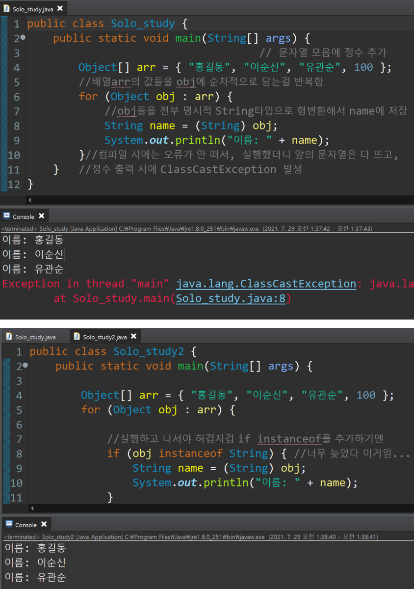 - 특정 데이터형만 추출할때는 instanceof 연산자를 사용하여 일치하는 데이터만 추출하도록 코드 추가