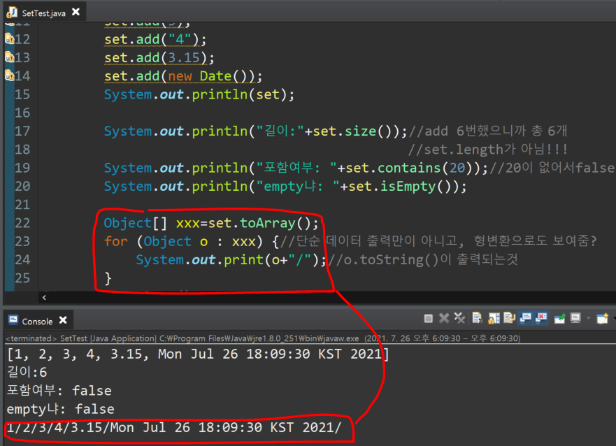 - Object [ ] 변수 = 변수.toArray( ); ==> 저장된 데이터를 Object 배열로 변환만 해줌. 출력XXX
