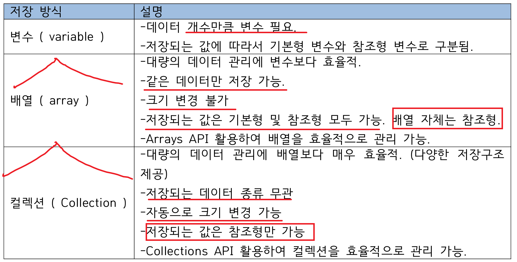 <변수와 배열과 컬렉션의 차이점>