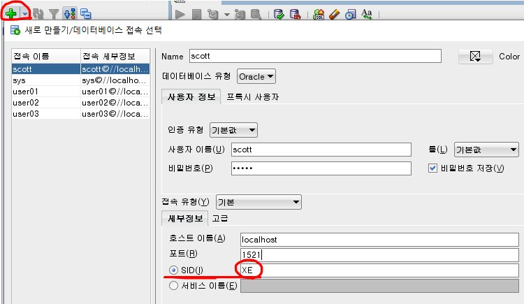 Stringurl ="jdbc:oracle:thin:@localhost:1521:orcl"; //마지막 orcl를 SID라고 하는데 이것만 쓸 계정으로 바꿔주면됨