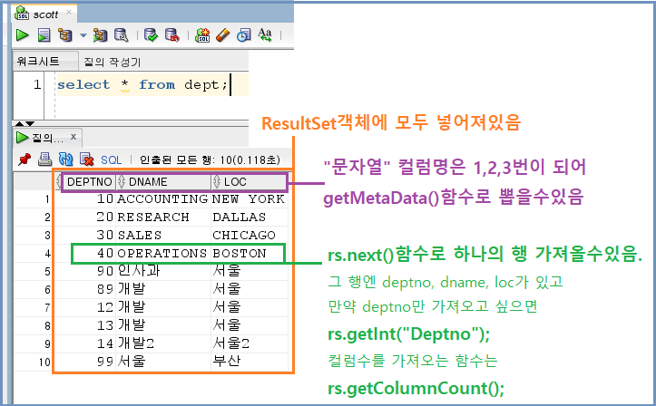 int deptno = rs.getInt("deptno"); //1번째 줄 "deptno"=int 10 ;