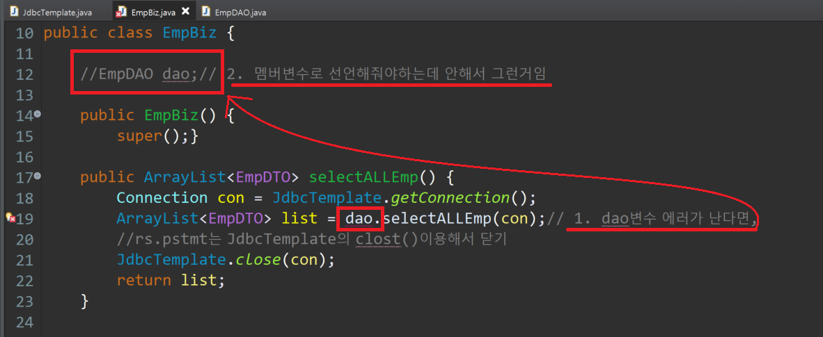 EmpDAO dao; 는 모든 함수들 안에서 변수로 쓰일 수 있게, 변수 선언만 되고 가만히 있음