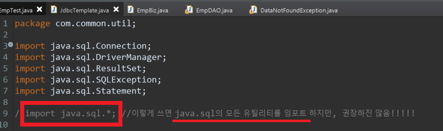 ㄴ//import java.sql.*; //이렇게 쓰면 java.sql의 모든 유틸리티를 임포트 하지만, 권장하진 않음
