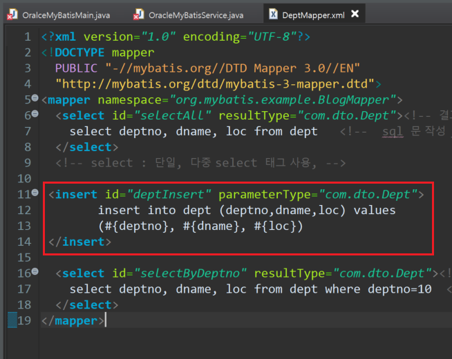 <insert id="deptInser" parameterType="com.dto.Dept"> 아직도 DTO가 이해가 안가냐..