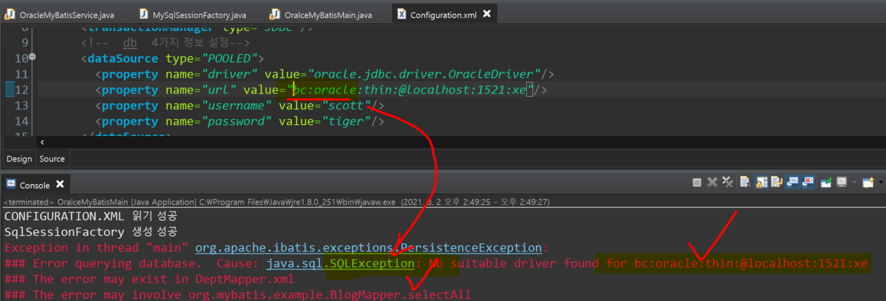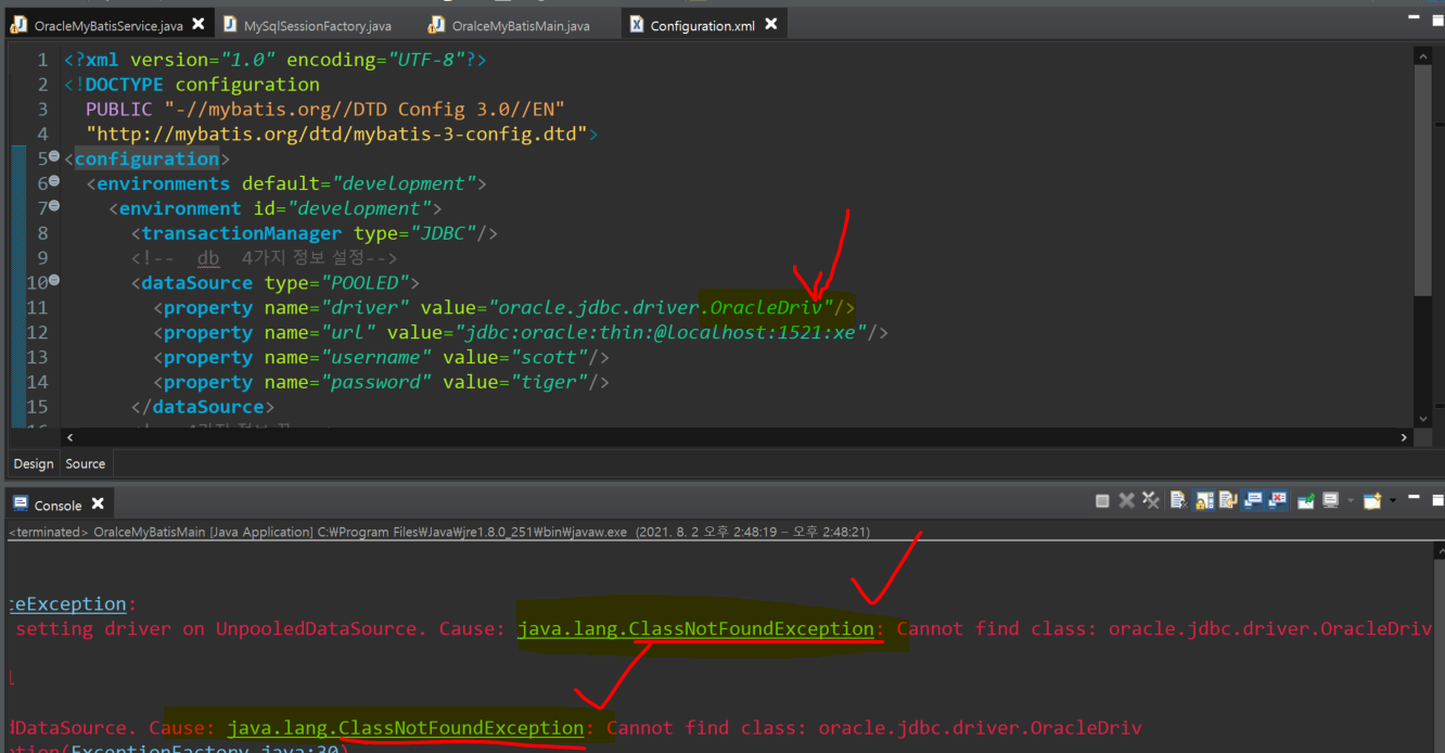 4. driver 이름을 잘못 적었으면, ClassNotFoundException 뜸