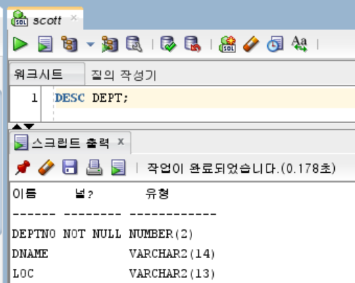 => 컬럼이름, 널?, 컬럼데이터유형 (숫자인지 문자인지 날짜인지)