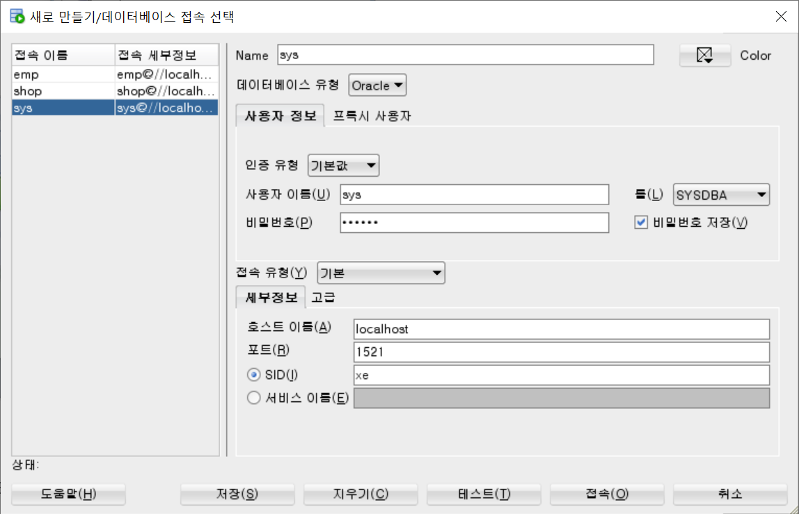 -> 테스트 -> '상태:성공' 뜨면 '▣비밀번호 저장' 체크 후 '저장' -> 좌측에 sys 생성 완료