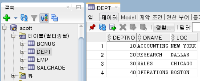 ex) scott 워크시트 -> SELECT * FROM DEPT; *=전체