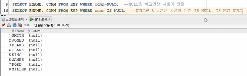 결과값도 NULL (56쪽) => IS NULL, IS NOT NULL이라는 문구를 사용하면 연산비교 가능