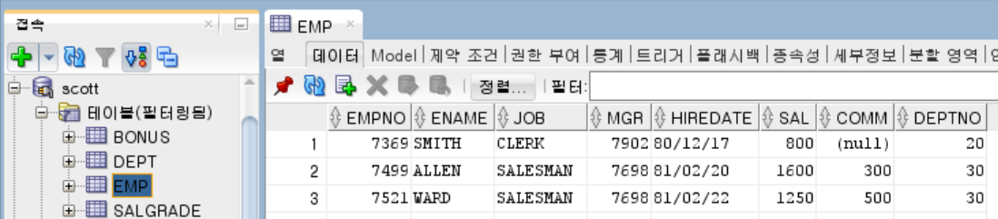 테이블 EMP -> 데이터-> EMPNO (employee number 사번) ENAME(사원이름) MGR(관리자번호) SAL(급여) COMM(상여금)