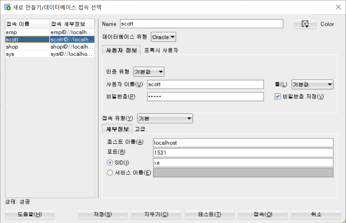 -> 위 다시 하면 테스트 성공 뜨고 '비밀번호저장' 체크 후 저장해서 좌측 scott 생성완료
